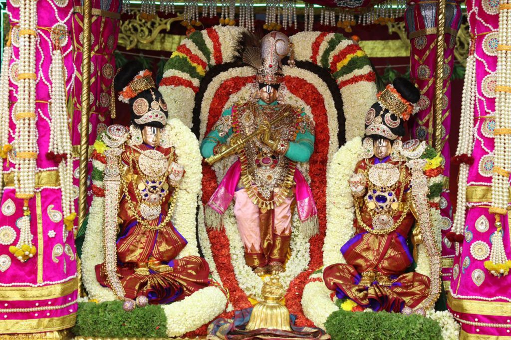 On the third day evening of the Srivari Navaratri Brahmotsavams on Sunday the utsava idol of Sri Malayappa Swamy, in Rukmini Sathyabhama Sameta Murali Krishna alankaram was seated under the `Muthyapu Pandiri Vahanam’.