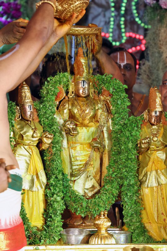 Temple priests of Sri Vari Temple performed ‘SNAPANA TIRUMANJANAM’ (Celestial Bath) to the processional deity of Lord Malayappaswamy and His consorts at Vasantha Mandapam on the second day of ongoing three day Annual Vasanthotsavam at Tirumal.