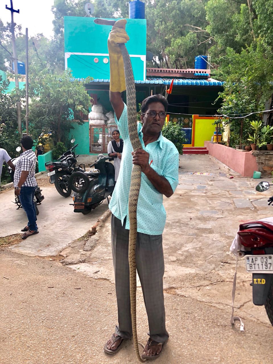 A 9 feet-long snake creates panic in Tirumala on Tuesday. The reptile entered into house no 894 in balaji colony. Seeing the snake the residents shouted and ran away. They informed the matter to snake catcher Bhaskar Naidu. He reached the colony and catched the snake with the help of equipments. Later, the snake was released in nearby forest the abode suited best for him.