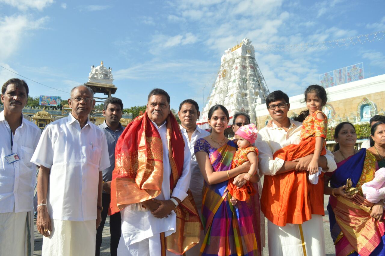 AP Assembly Deputy Speaker Mandali Buddha Prasad has visited the hill shrine of Tirumala to offer his prayers to Lord Venkateswara. Accompanied with his family members, he arrived at Tirumala yesterday and had darshan of the diety during VIP break today morning. After darshan, the temple authorities handed him laddu prasadam and holy water to him at Ranganayakula Mandapam.