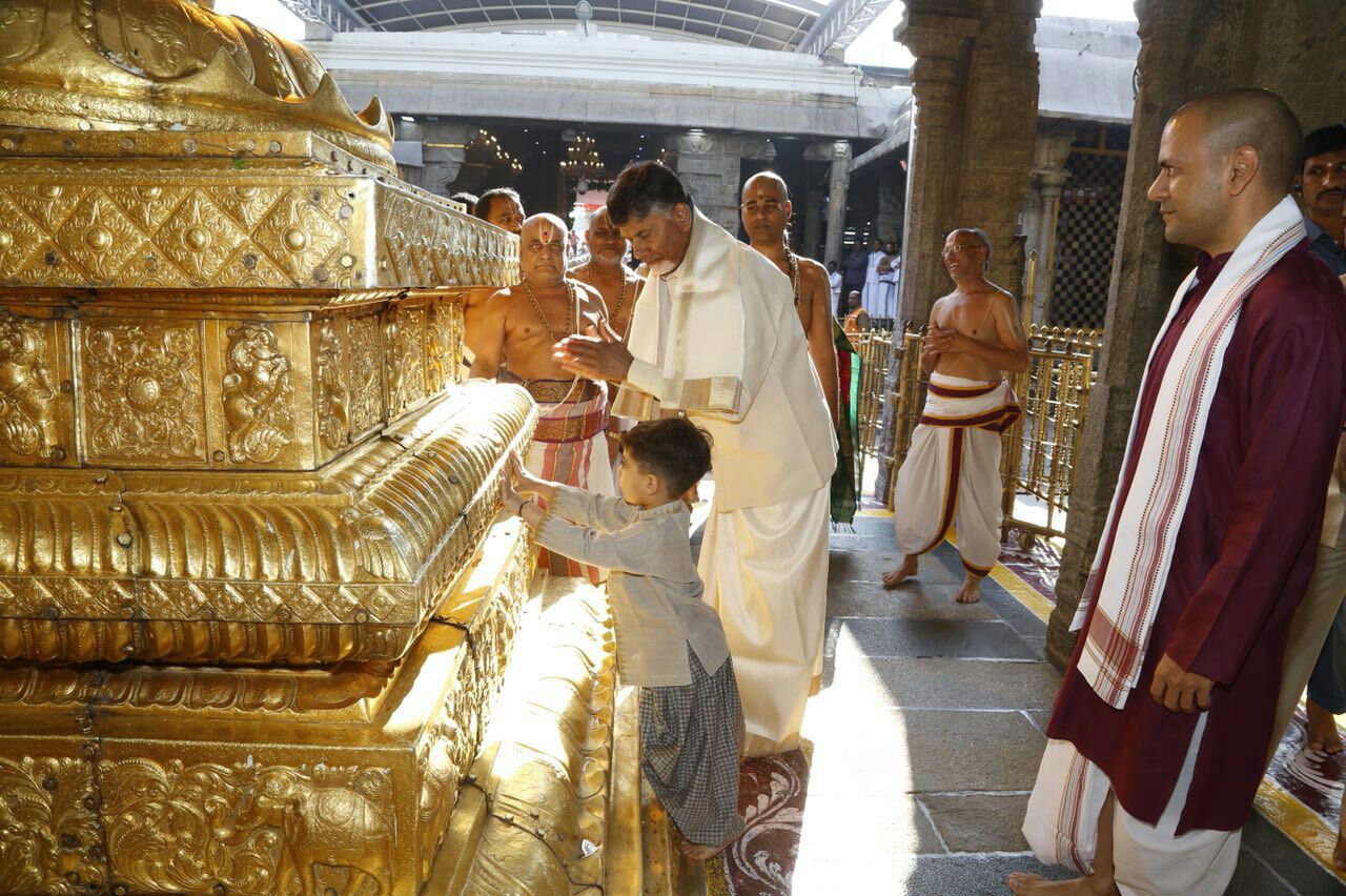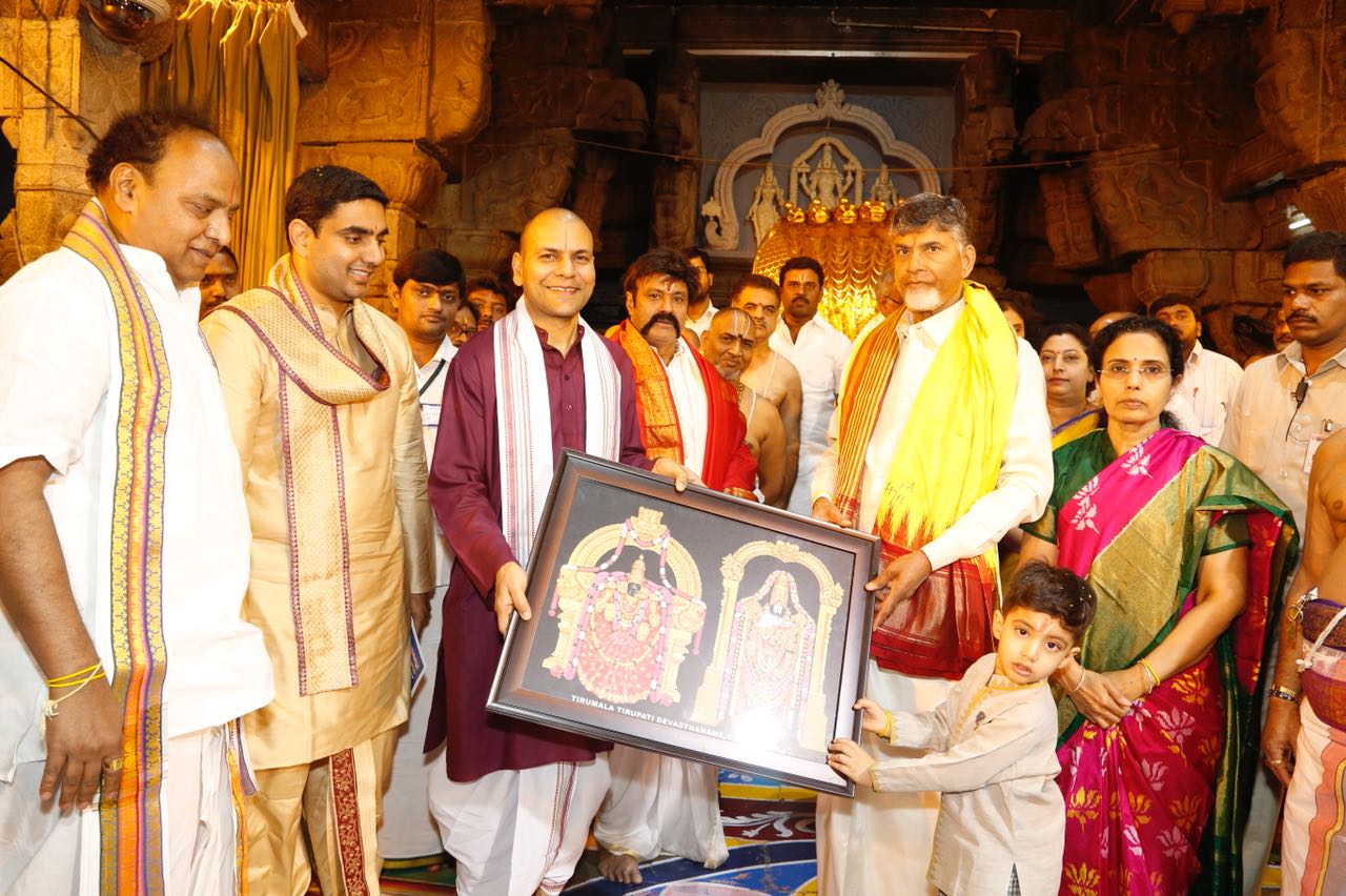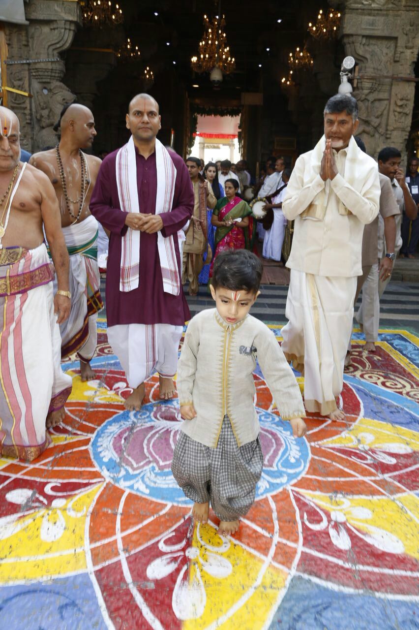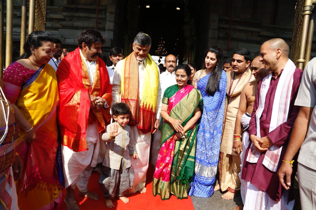 Andhra Pradesh Chief Minister N. Chandrababu Naidu and his family members visited Tirumala to offer prayers to the Lord Venkateswara on the occasion of the Fourth Birth Day of his Grandson Chi Devansh. Accompanied by his son and Panchayat Raj Minister Nara Lokesh, Hindupur MLA N Balakrishna, Nara Brahmani, Nara Bhuvaneswari and Nara Devansh, CBN had darshan of the deity today morning.