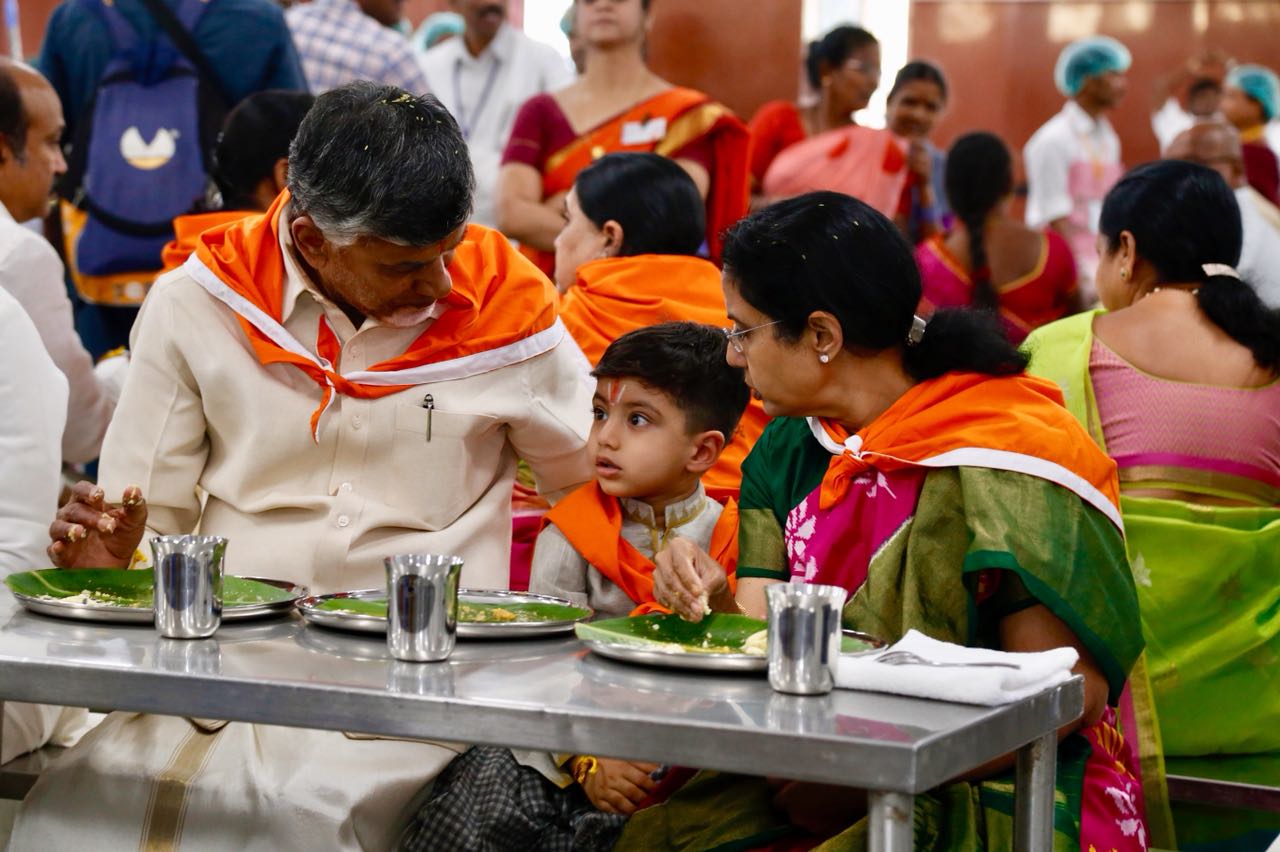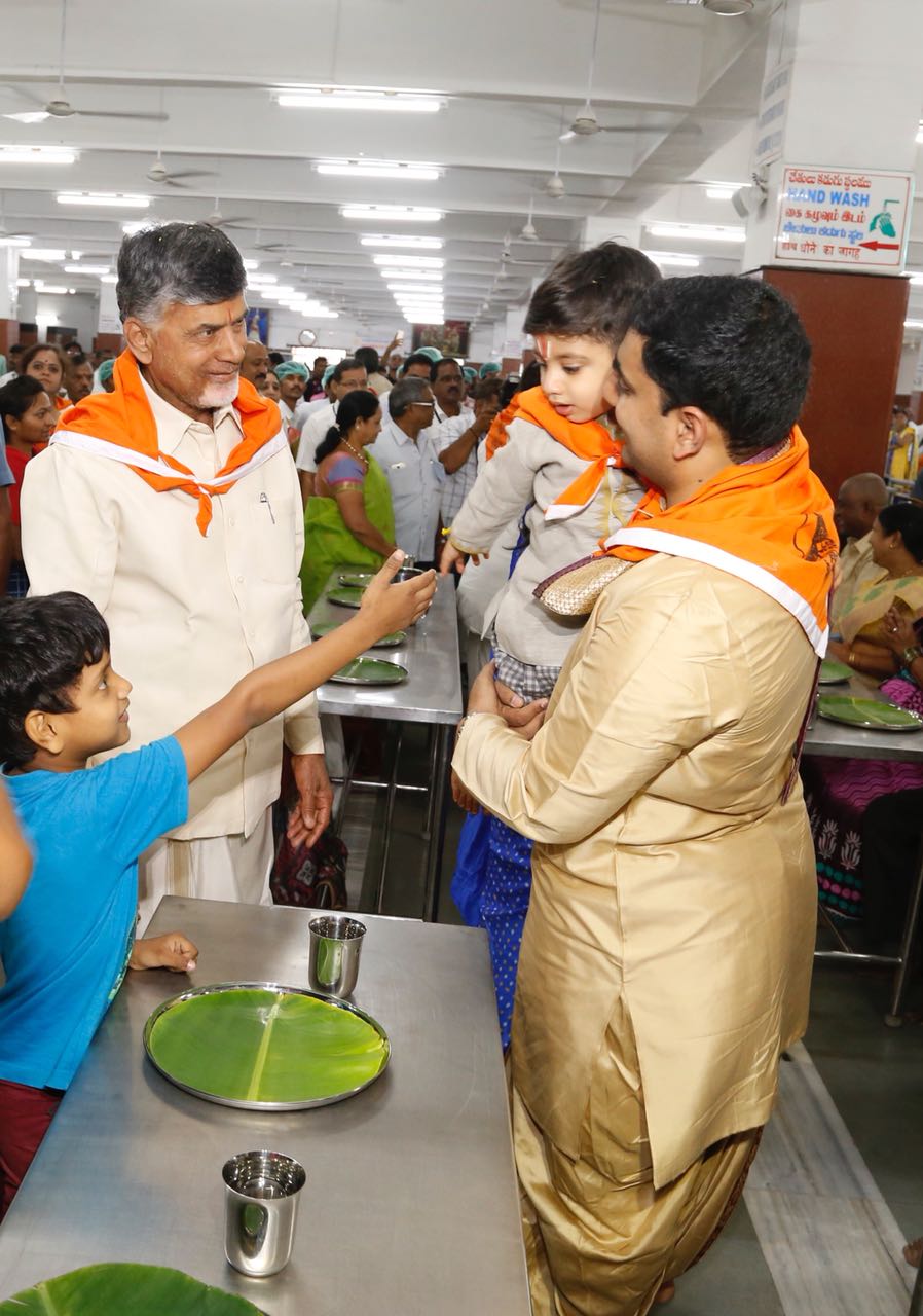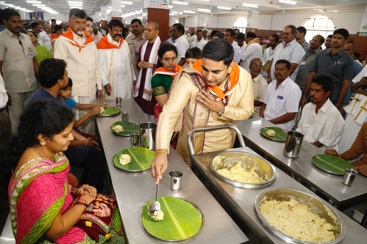 Naidu and his family members later served annaprasadams in Matrusri Tarigonda Vengamamba Annaprasadam Complex (MTVAC) in Tirumala. The CM along with his wife Smt Bhuvaneshwari, his son and Minister of AP Sri N Lokesh, Brother-in-Law and Hindupur Legislator Sri N Balakrishna, along with their spouses served pongal and kichidi to pilgrims wearing Srivari Seva scarves and rendered service. Later they also had annaprasadam.
