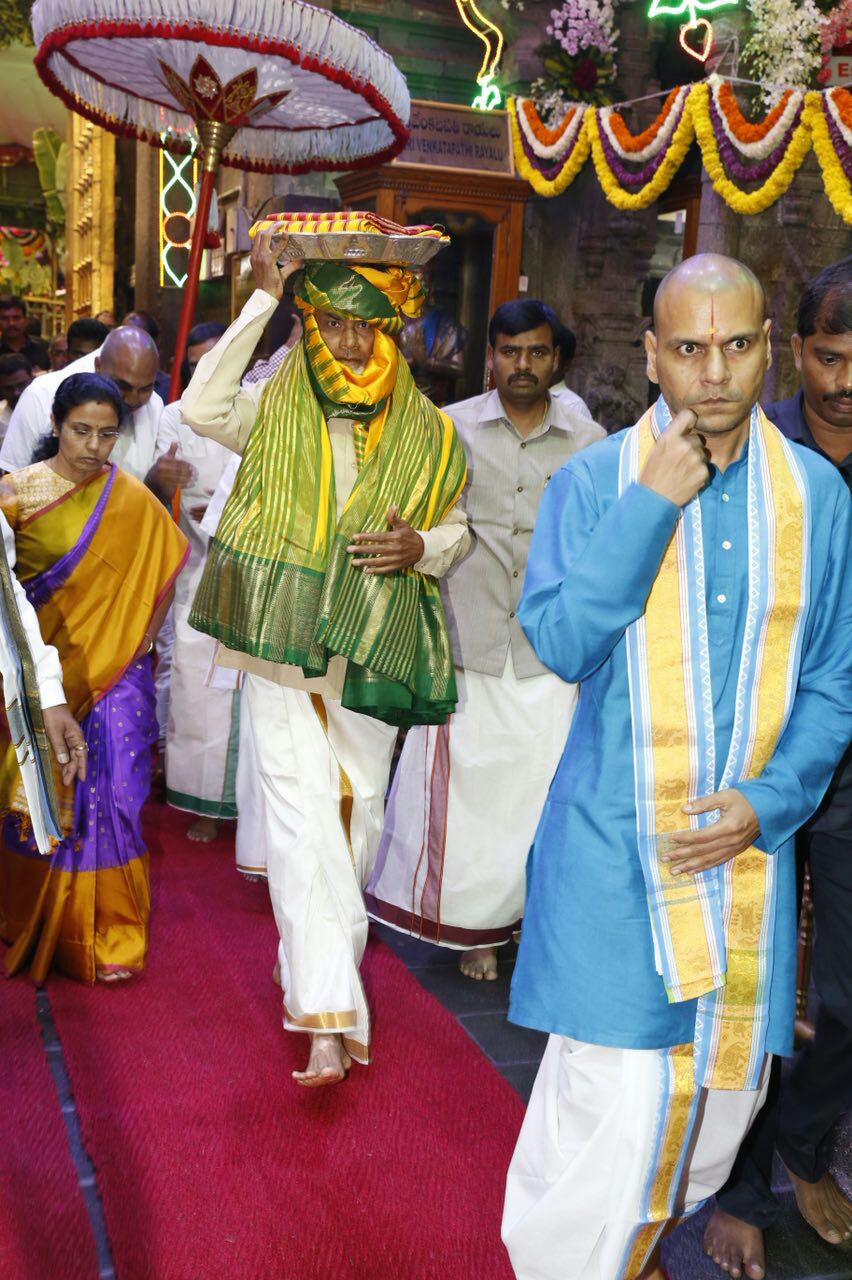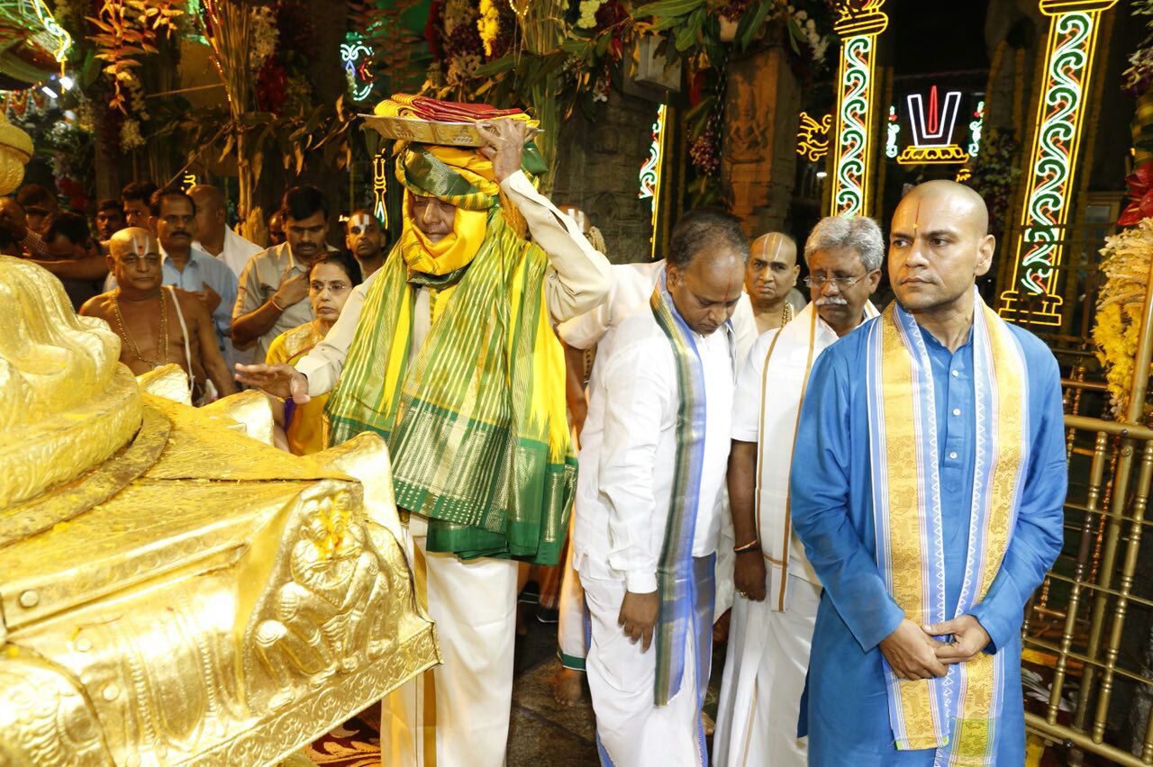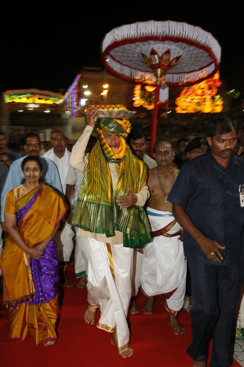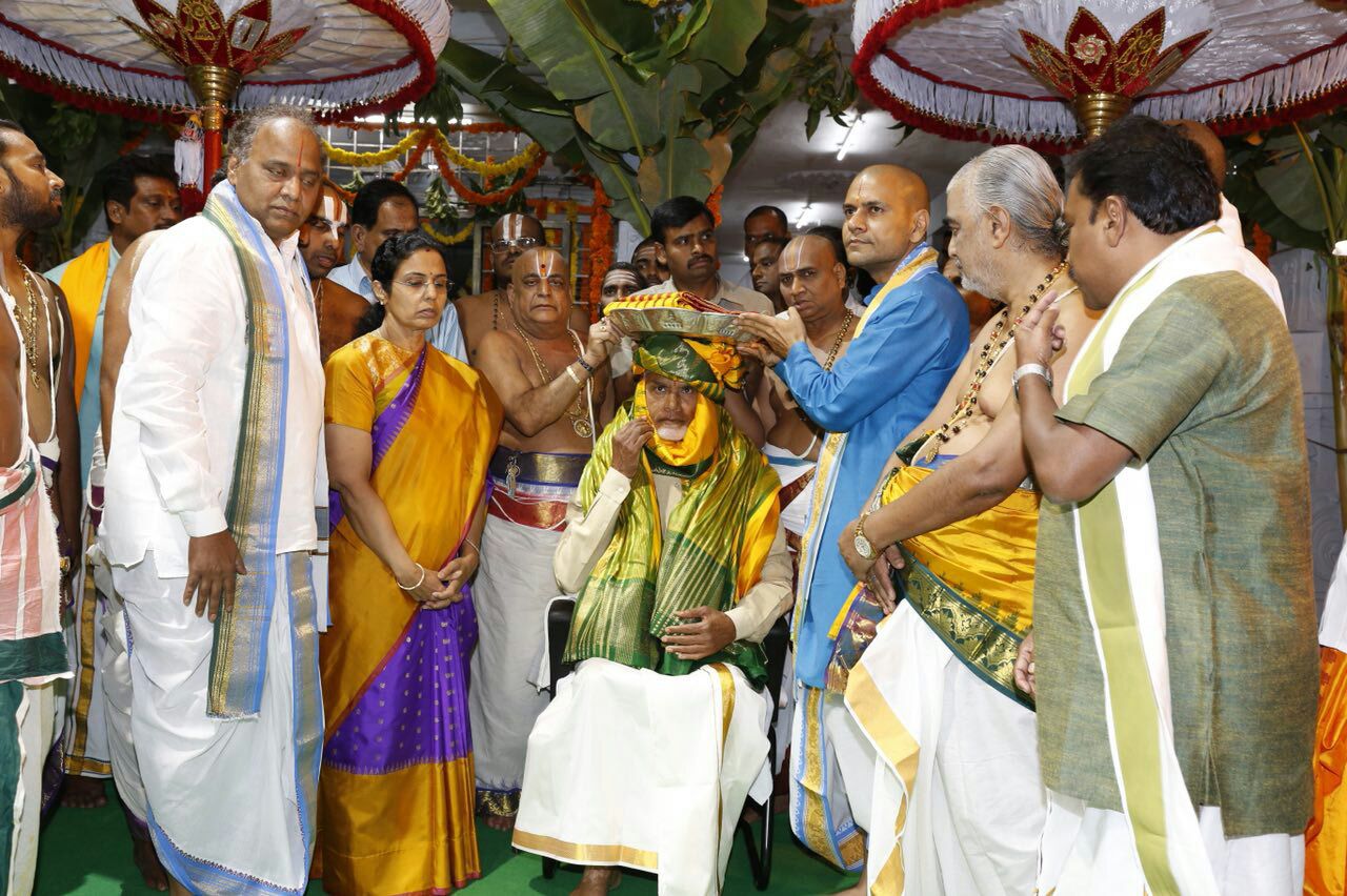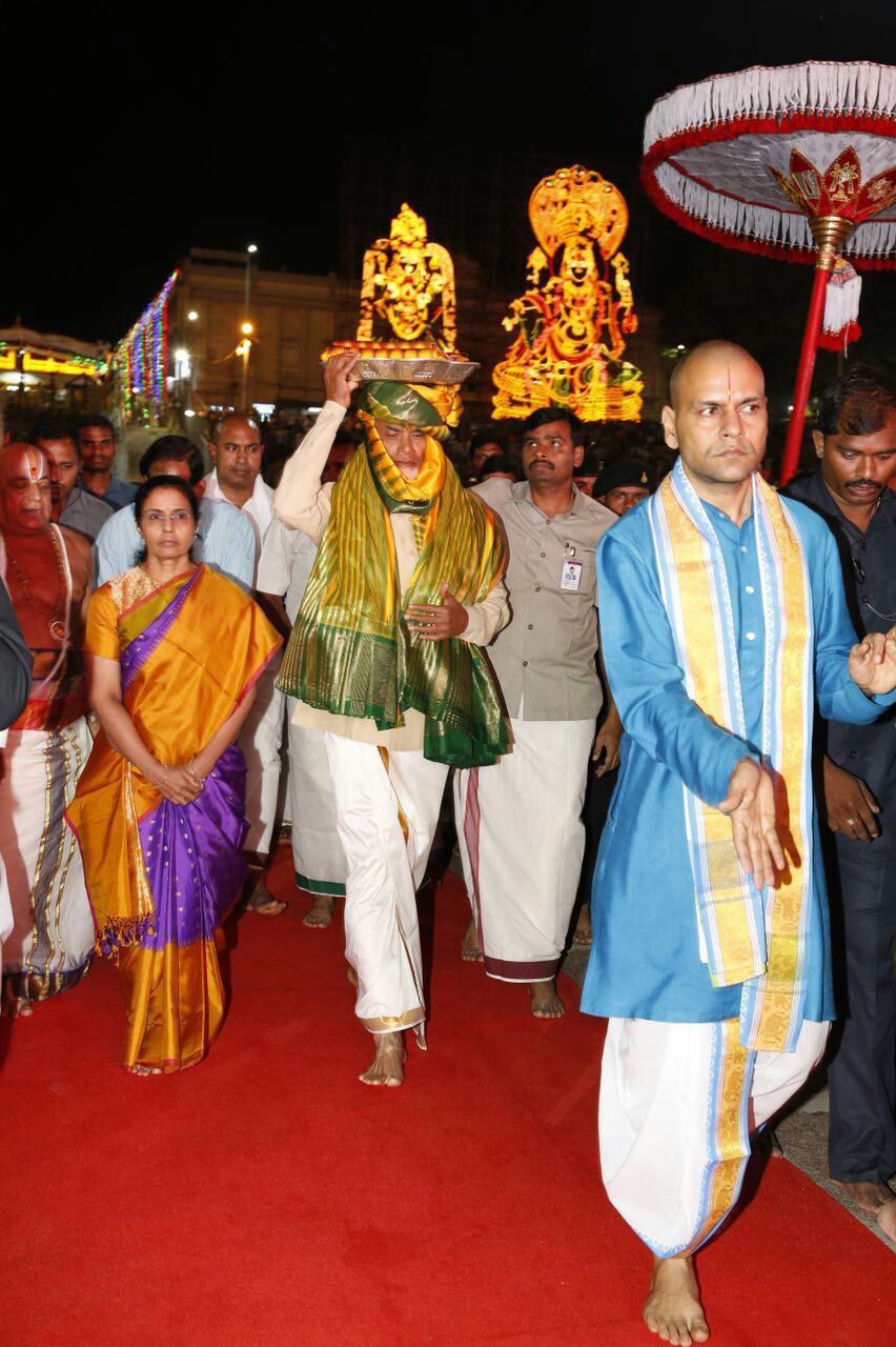 Andhra Pradesh CM Nara Chandrababu Naidu presented silk clothes to Lord Venkateswara on behalf of government. After having darshan of bedi anjaneya swami the CM prays the presiding diety and presented silk clothes to TTD administration. After darshan the temple preists gave vedasirvachanam to the CM at Ranganayakula mandapam.