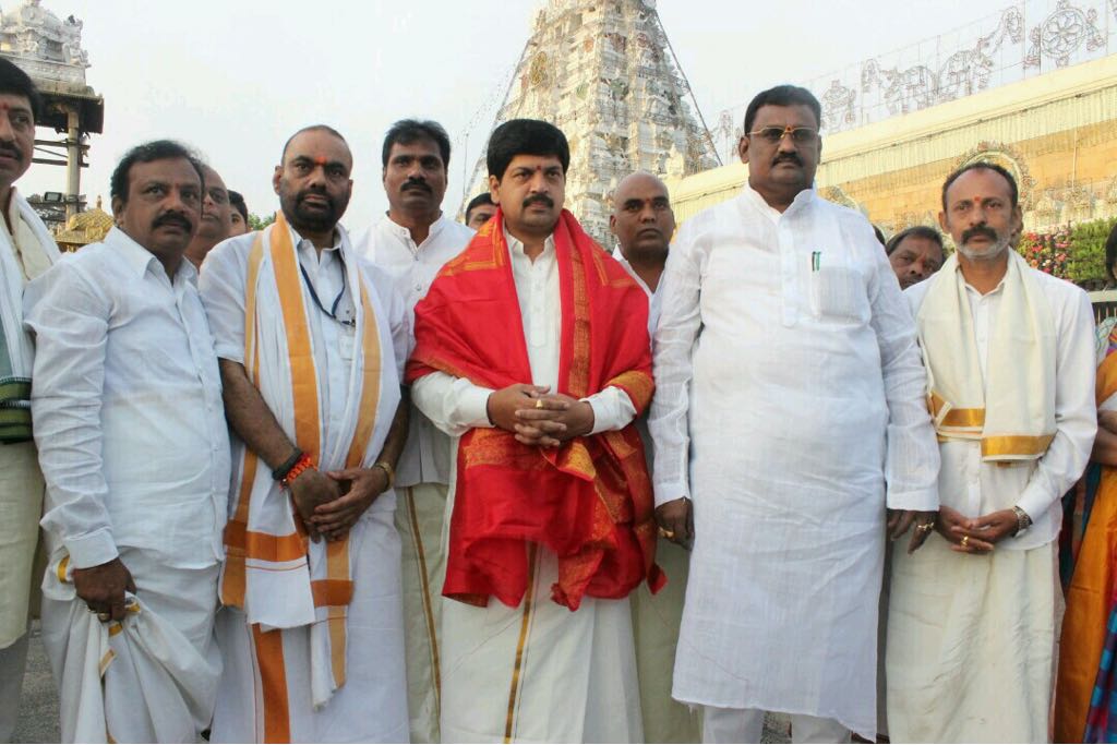 AP minister kollu Ravindra has visited Tirumala hill shrine today to offer his prayers to Lord Venkateswara. Accompanied by his family, Ravindra had darshan of the diety during VIP break. After darshan temple officials offered Laddu prasadam and holy water to him at Ranganayakula mandapam.