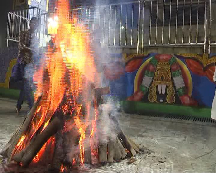 Bhogi’ was celebrated with traditional zeal in Tirumala on Sunday, when residents and pilgrims gathered and burnt the household junk material infront of the temple.