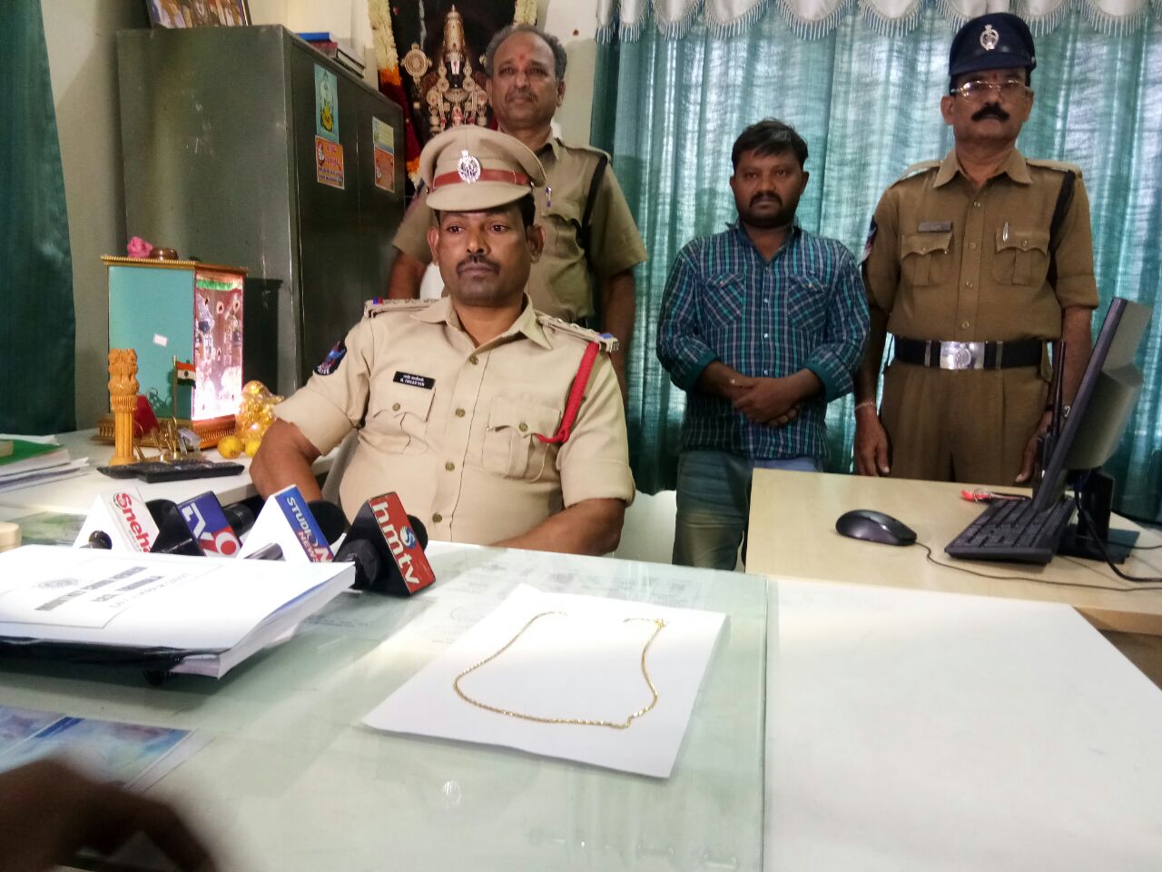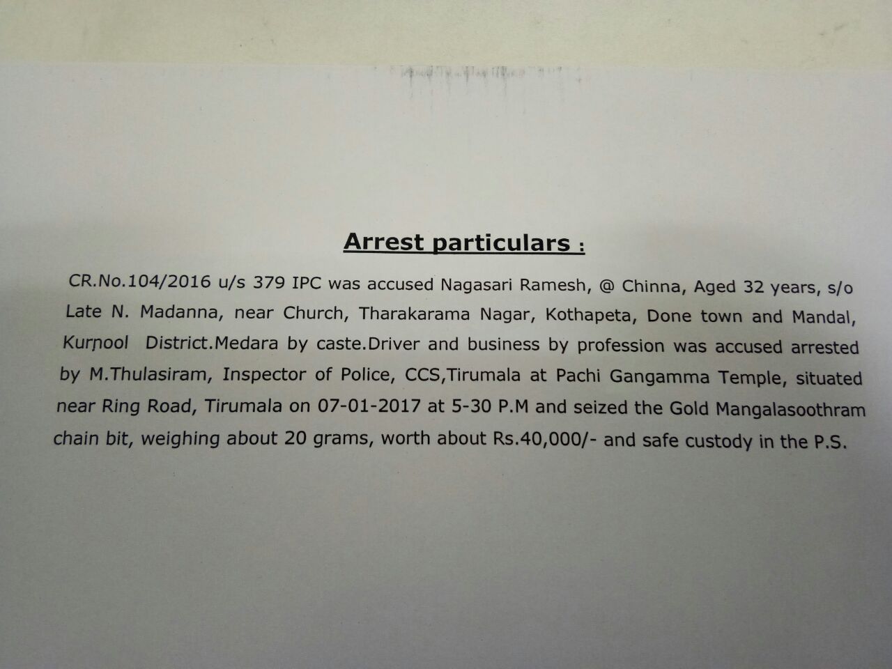 M. Thulasiram, Inspector of Police, CCS, Tirumala on Sunday arrested Nagasari Ramesh alias Chinna (32) and seized the Gold Mangalasoothram chain bit, weighing about 20 grams, worth about Rs. 40,000/-. Native to Kurnool District, Ramesh is Driver by profession and he was arrested at Pachi Gangamma Temple, situated near Ring Road, Tirumala.