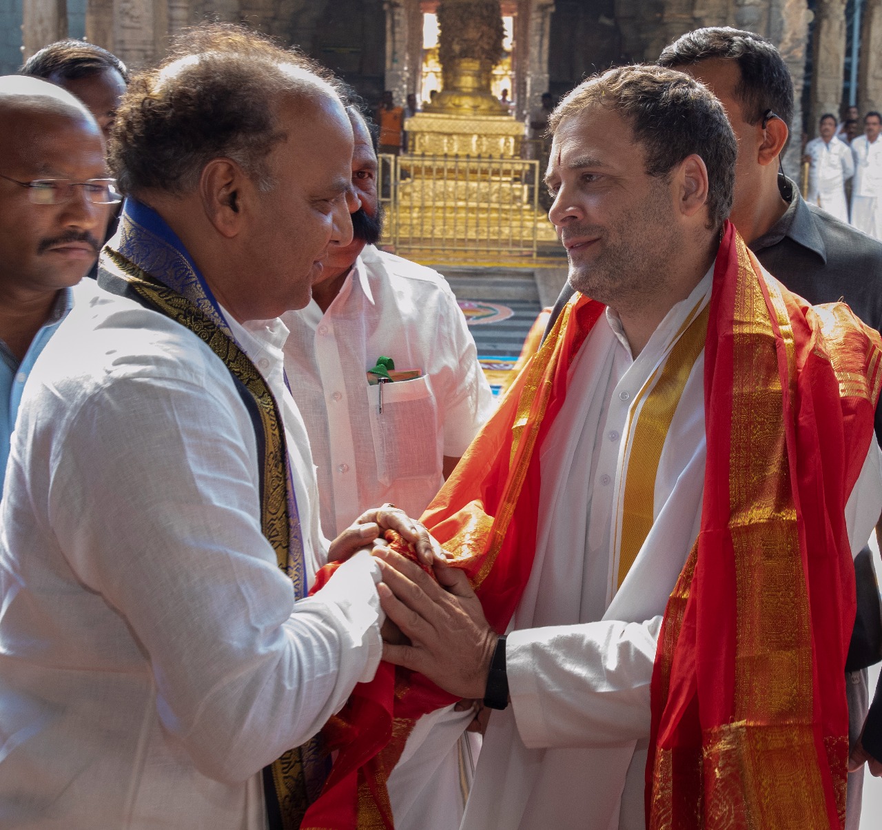 Congress President Rahul Gandhi has offered prayers to Lord Venkateswara today afternoon. Rahul reached Tirumala by walk through Alipiri Footpath along with scores of his followers. Later, Rahul had darshan of the deity in a special darshan. After darshan temple preists rendered vedasirvachanam to him at ranganayakula mandapam. TTD JEO presented Laddu prasadam and God laminated photo to Rahul.