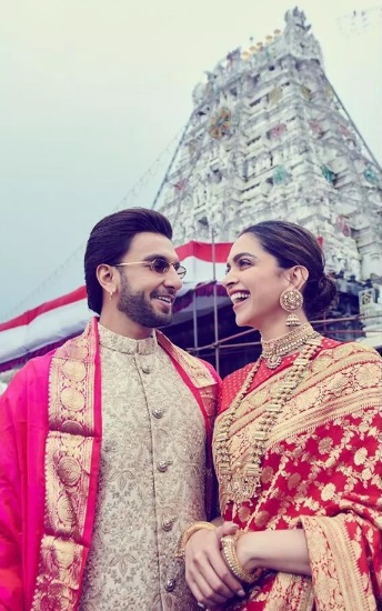Deepika is seen wearing a bright red kanjeevaram saree along with traditional jewellery. While Ranveer Singh wore an ivory-shade kurta pyjama and gold earrings, and the couple looked stunning in their traditional attire. TTD officials offered laddu prasasdam and holy water to the couple at Ranganayakula mandapam.