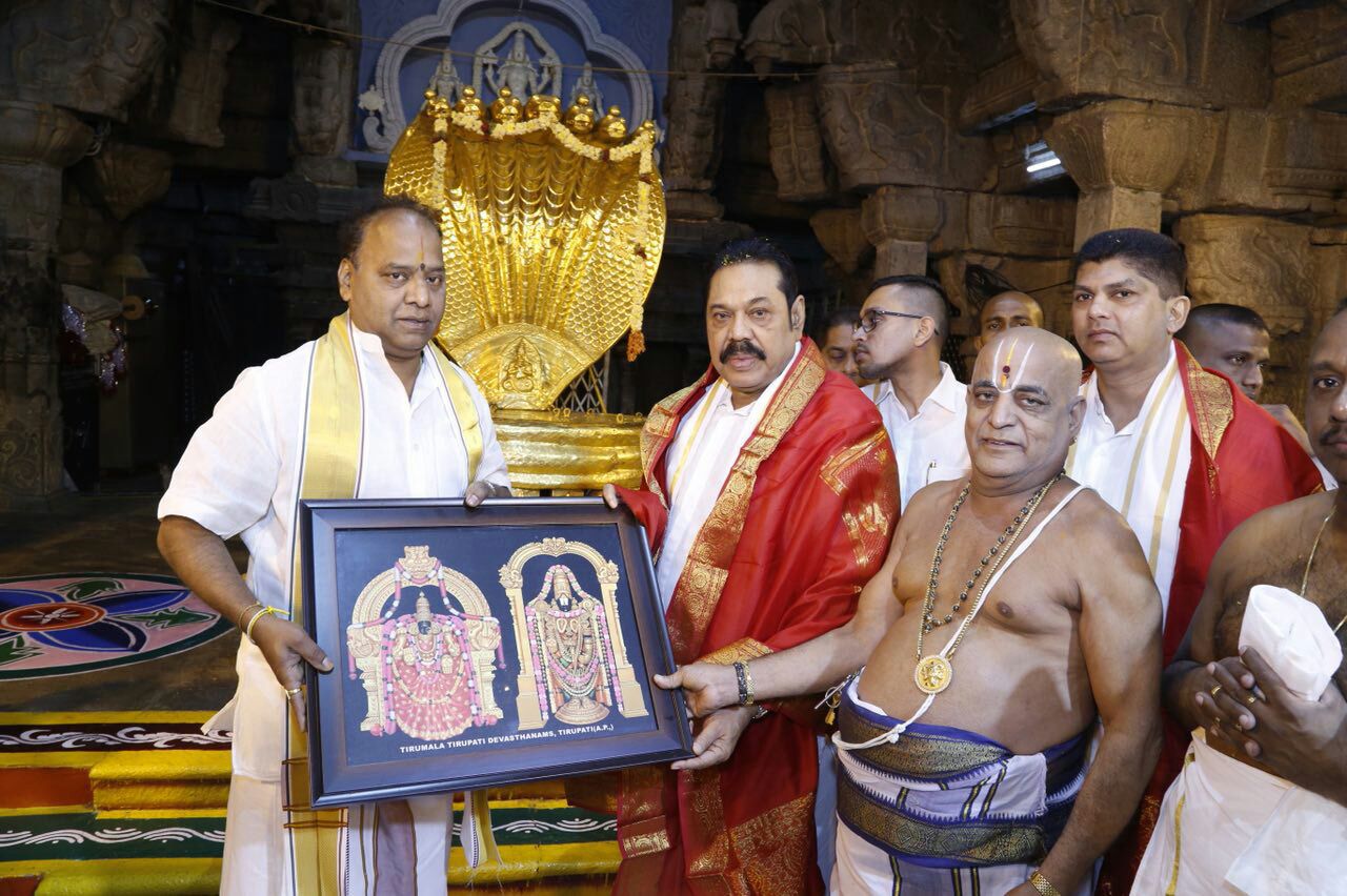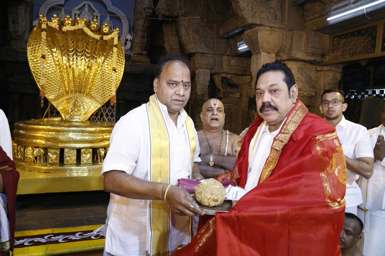 Former Sri Lankan President Mahinda Rajpaksa offered prayers to Lord Venkateswara in Tirumala today morning. He had darshan of the deity during VIP break. After the darshan, the priests showered ‘Vedasirvachanams’ on him and honoured him with silk vastram while the TTD JEO KS Srinivasa raju presented him with a memento and laddu prasadam.