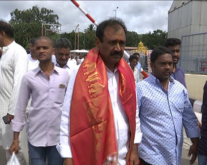 YSRCP leader and Former TTD Chairman Bhumana Karunakar Reddy has visited Tirumala hill shrine and offered his prayers to Lord Venkateswara. He had darshan of the deity during VIP break. After darshan, temple officials offered Laddu Prasadam and holy water to him at Ranganayakula mandapam.