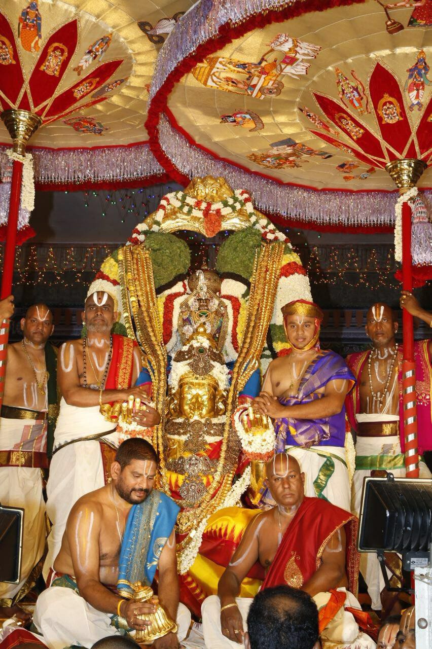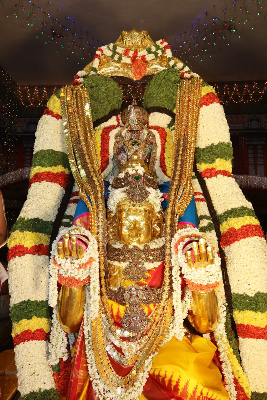 The Garuda Vahanam on the fifth day of the Srivari Saalakatla Brahmotsavams is considered the most significant of all events in the festival. Thousands of devotees throng Tirumada mada streets to see this celebration. The flowers decorated to Goda Goddess brought from Sri Ville Puthuvur will be decorated to Malayappa Swamy during Garuda Vahana seva.