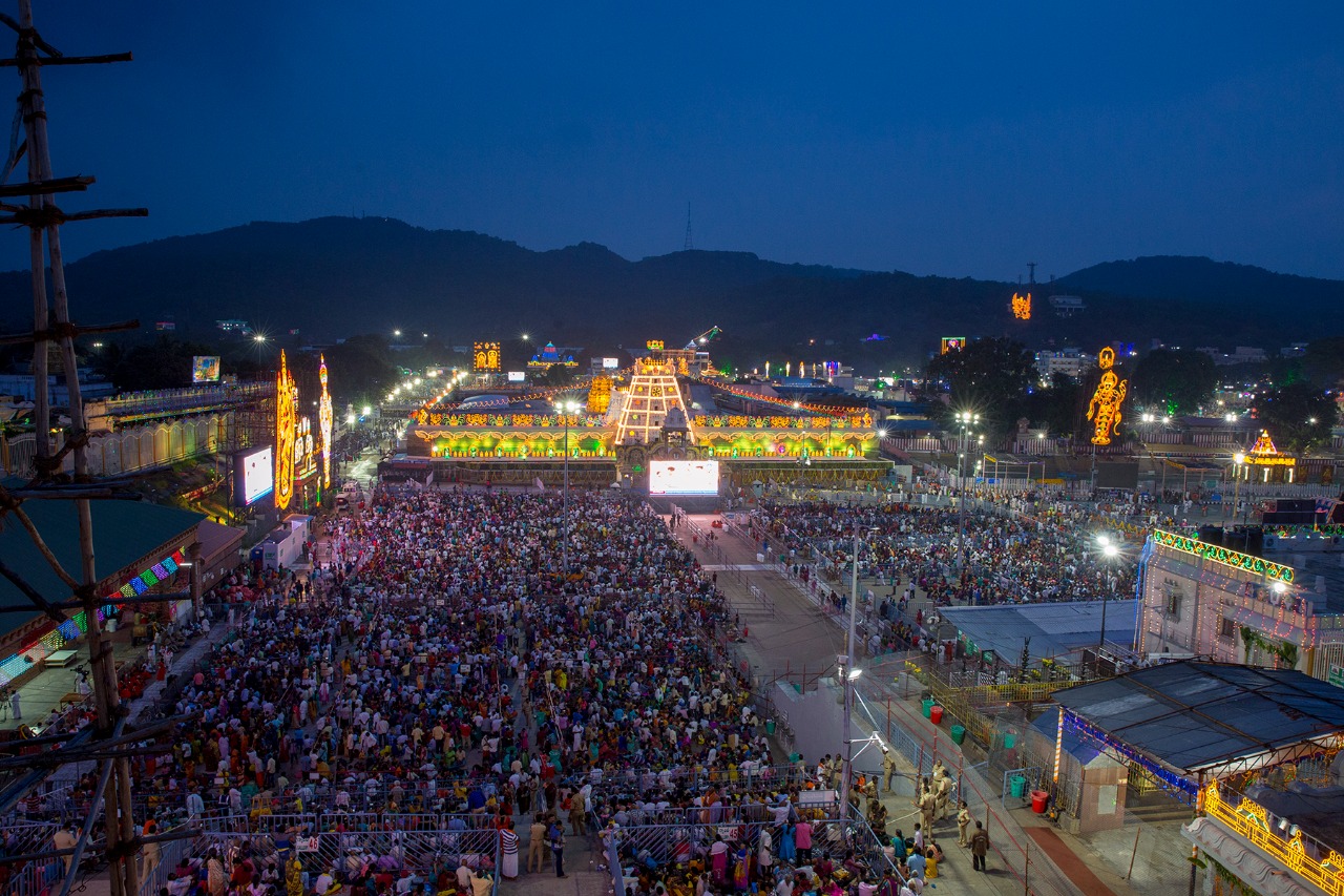 As soon as Lord Malayappa Swamy, sitting gracefully on the mighty Garuda Vahanam, moved from Vahana Mandapam at the scheduled time of 7:30 pm, the entire hill town reverberated to the rhythmic chants of “Govinda Nama.” As the Lord moved along the streets surrounding the temple on his favourite carrier Garuda wearing the new Sahasranama Kasula Haram, the devotion zoomed among the pilgrims sitting in galleries who witnessed the grandeur of Lord with utmost devotion.