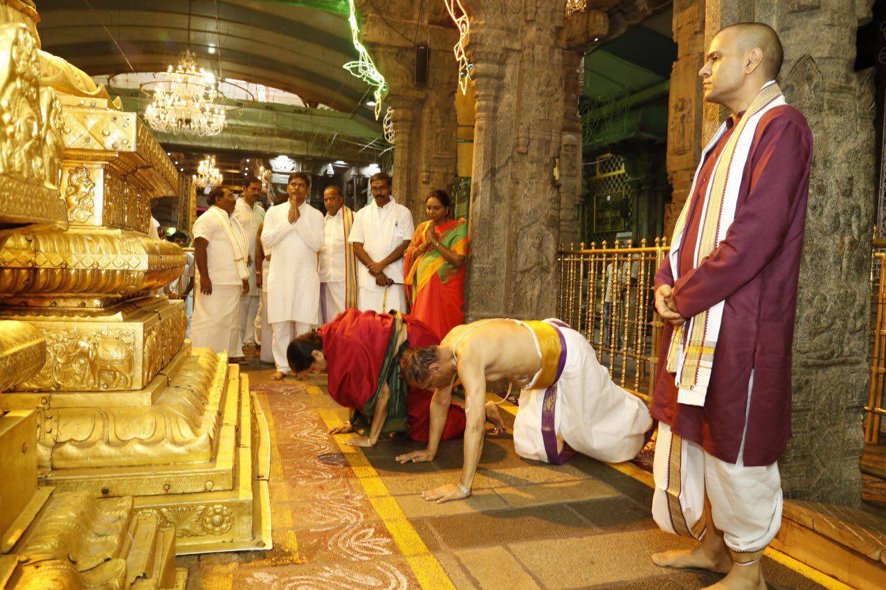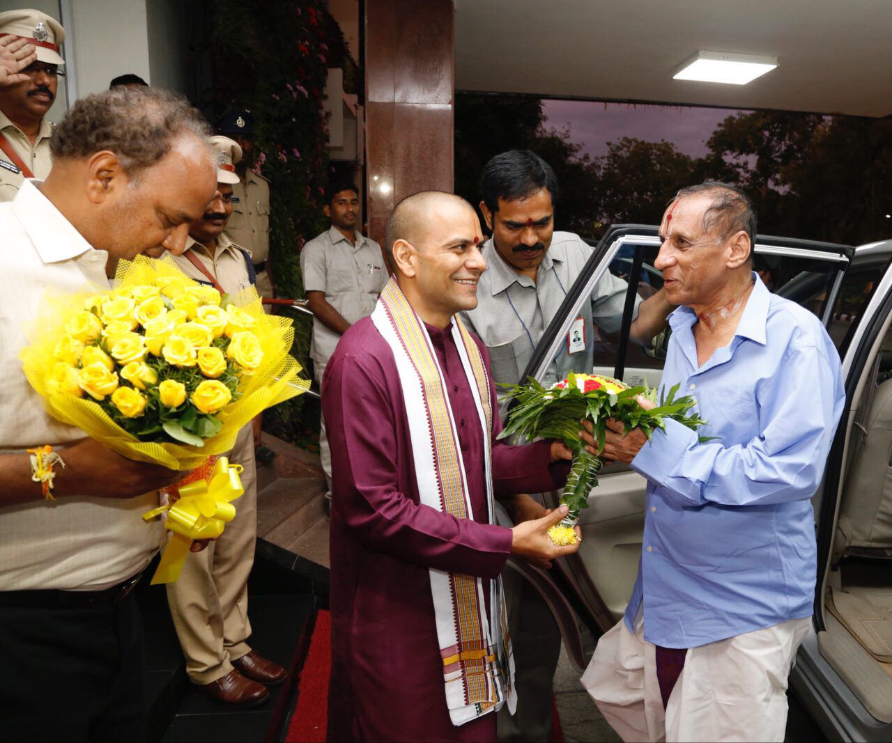 Governor of Andhra Pradesh and Telangana E.S.L.Narasimhan has visited the holy shrine of Tirumala and offered his prayers to Lord Venkateswara on Wednesday evening. Accompanied by Wife Smt Vimala Narasimhan, the Governor reached the temple town of Lord Venkateswara, Tirumala yesterday afternoon. The temple officials received him with the traditional temple honors and escorted him into the sanctum sanctorum where he paid his obeisance to the deity. TTD EO offered Laddu Prasadam to him at Ranganayakula Mandapam.