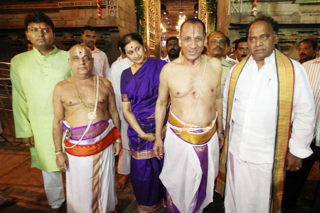ఆంధ్రప్రదేశ్, తెలంగాణ రాష్ట్ర ప్రజలకు గవర్నర్ నరసింహన్ ముందుగానే ఉగాది శుభాకాంక్షలు తెలిపారు. శుక్రవారం ఉదయం తిరుమల శ్రీవారిని దర్శించుకున్న ఆయన ఆలయం ముందు మీడియాతో మాట్లాడుతూ ఇరు రాష్ట్ర ప్రజలకు శుభాకాంక్షలు తెలిపారు.. శ్రీవారి దర్శనార్థం విచ్చేసిన గవర్నర్ ముందుగా క్షేత్ర సాంప్రదాయాన్ని పాటిస్తూ పుష్కరిణిలో సంప్రోక్షణ చేశాక శ్రీ వరహస్వామిని దర్శించుకున్నారు. అటు తరువాత ఆలయ మహాద్వారం వద్దకు చేరుకున్న గవర్నర్ దంపతులకు టీటీడీ ఉన్నతాధికారులు, అర్చకులు సాంప్రదాయం ప్రకారం స్వాగతం పలికి ప్రత్యేక దర్శన ఏర్పాట్లు చేశారు. అనంతరం శ్రీవారి ములవిరాట్టును దర్శించుకున్న గవర్నర్ దంపతులు హుండీలో కానుకలు సమర్పించి మొక్కులు చెల్లించుకున్నారు. అటు తరువాత ఆలయంలోని రంగానాయకుల మండపంలో గవర్నర్ దంపతులకు వేద పండితులు వేదాశీర్వచనం పలుకగా, అధికారులు శ్రీవారి శేష వస్త్రం కప్పి, తీర్థ ప్రసాదాలు అందజేశారు. ఈ సందర్బంగా ఆలయం వెలుపల గవర్నర్ నరసింహన్ మాట్లాడుతూ ప్రజలకు సుఖసంతోషాలు, శాంతి సౌభాగ్యాలు కలగాలని దేవుడిని ప్రార్ధించినట్లు తెలిపారు. ఈ రోజు తిరుమలలోని నారాయణగిరి ఉద్యానవనంలో టీటీడీ నిర్వహిస్తున్న అన్నమాచార్య 514 వ వర్ధంతి వేడుకలలో గవర్నర్ పాల్గొంటారు…