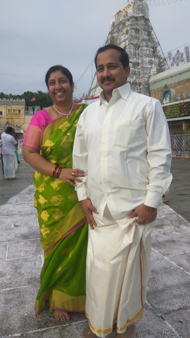 Andhra Pradesh Power Generation Corporation Limited director Muddada Ravichandra has visited Tirumala hill shrine to offer his prayers to Lord Venkateswara. Accompanied by his wife, he had darshan of the deity during VIP break. After darshan temple officials offered Laddu prasadam and holy water to them at Ranganayakula Mandapam.