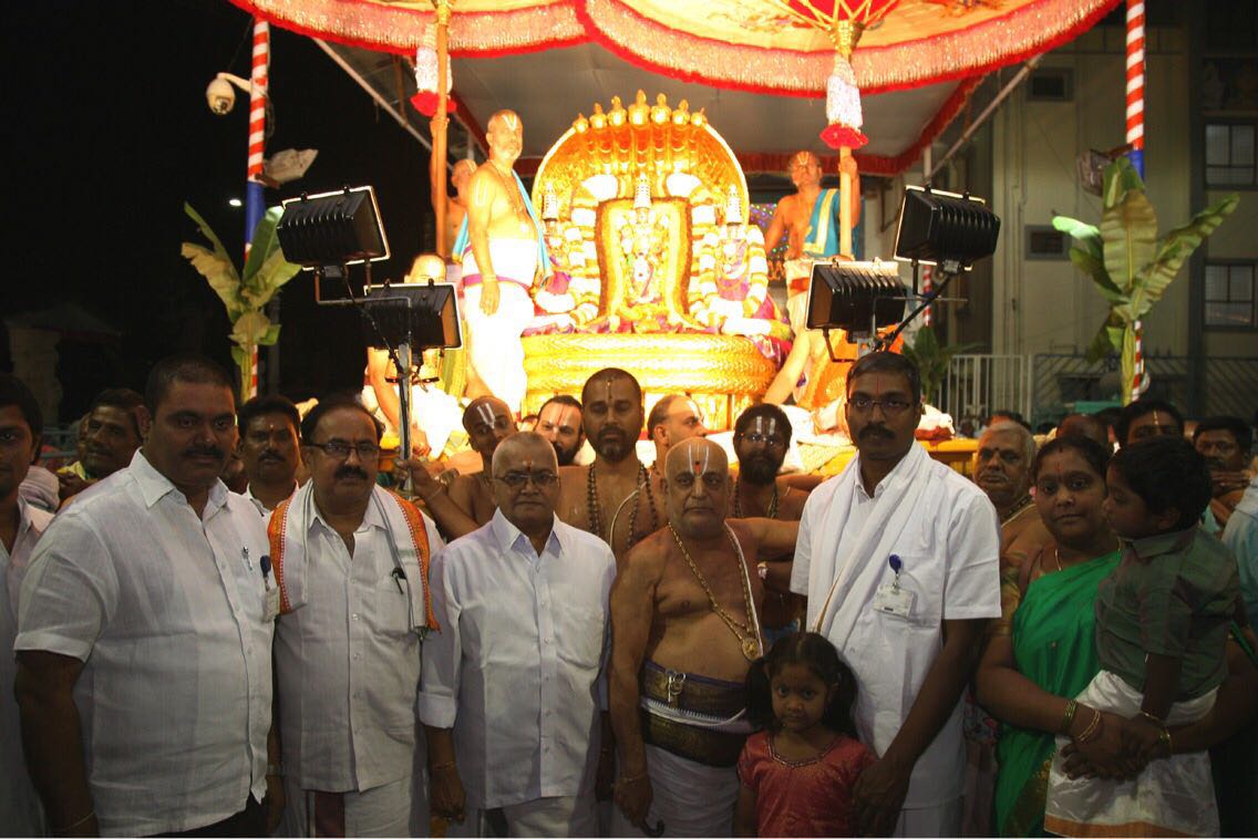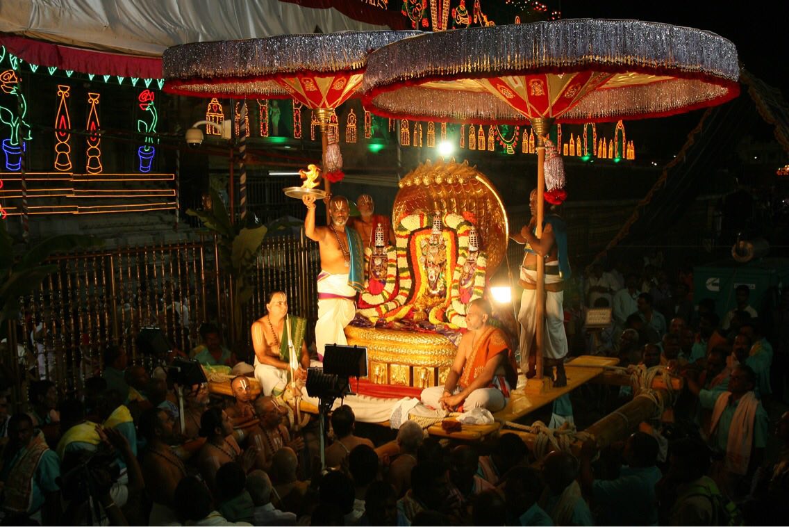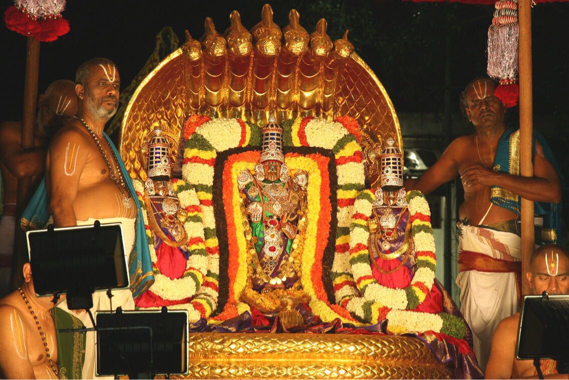The processional deity of Lord Malayappa Swamy along with His two Consorts, Sridevi and Bhudevi took celestial ride on Pedda Sesha Vahanam on the eve of auspicious Nagula Chaviti. Thousands of devotees had darshan of the lord in the colourfully decorated Peddasesha vahanam.