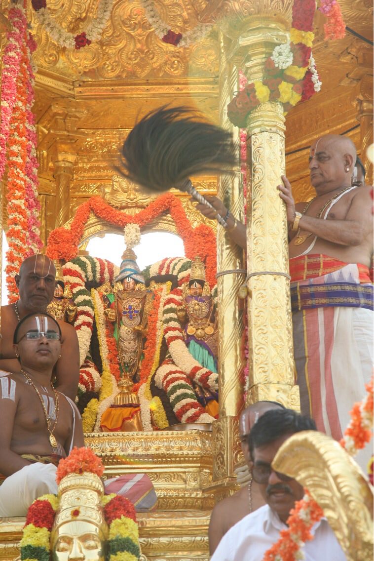 Lord Malyappa Swamy took a colourful ride with his two consorts, Sridevi and Bhudevi on the Swarna Ratham on Friday morning as par of the annual Vasantotsavams. All the three deities decked in silk vastrams and precious jewels, took a majestic ride on Swarna Ratham and blessed the devotees in four mada streets.