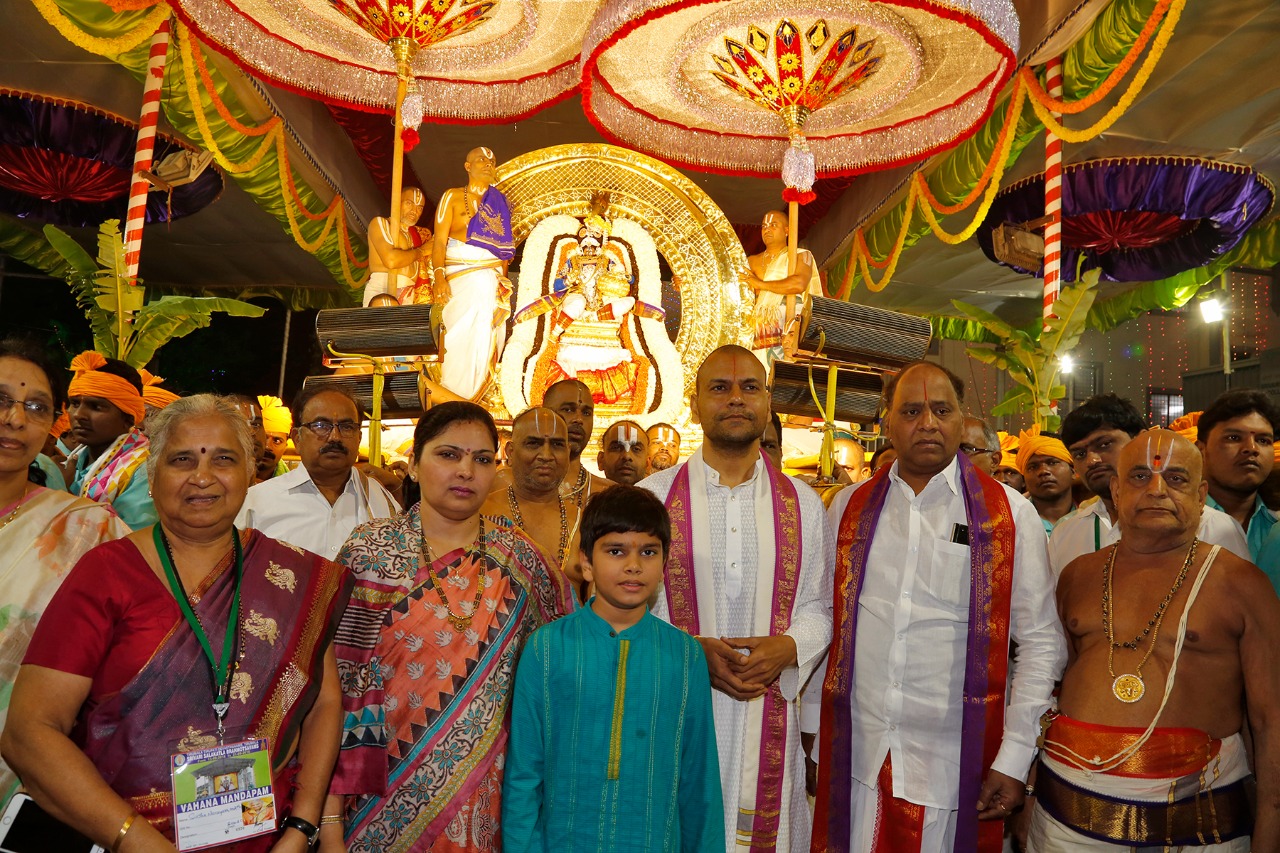 On the 7th day evening as part of the annual Brahmotsavams, Lord Venkateswara took celestial ride on Chandraprabha Vahanam to the delight of thousands of devotees who converged in the galleries of the four Mada streets at Tirumala to witness the blissful event.