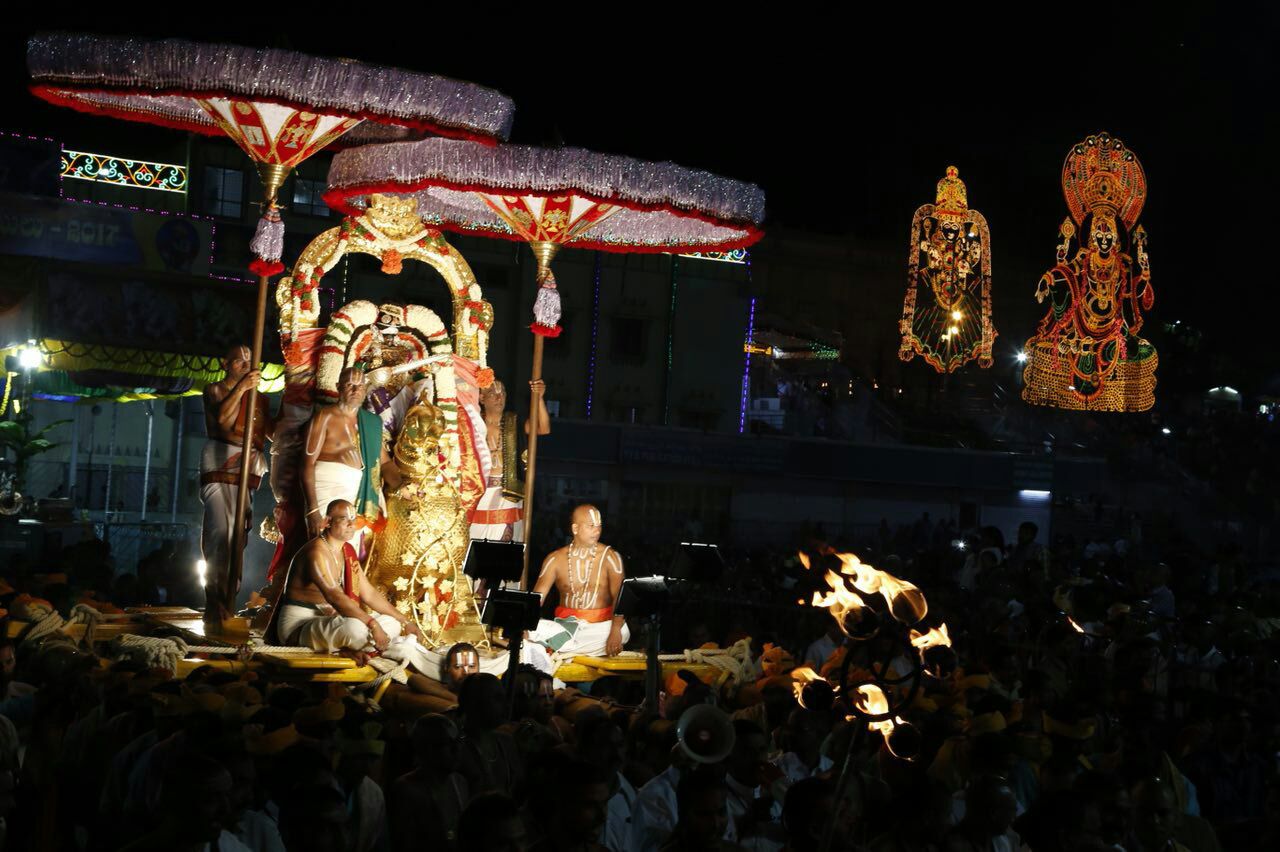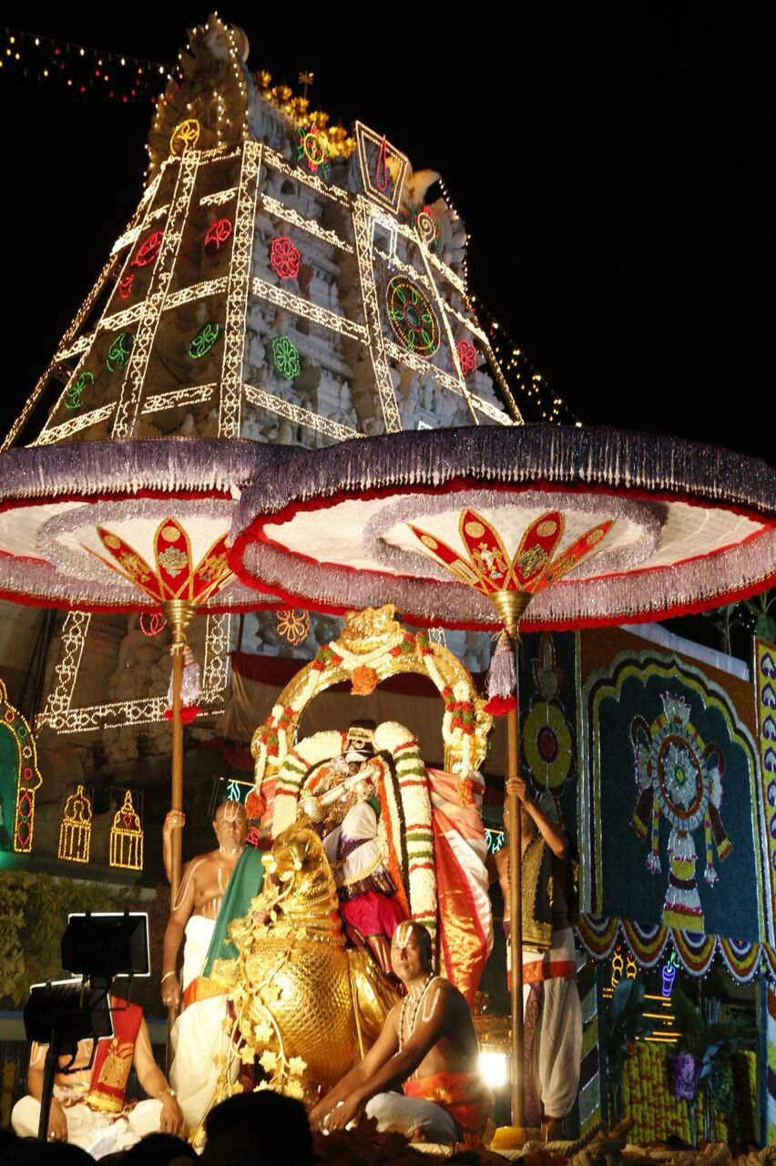 Sunday evening the processional Deity of Lord Malayappa Swamy along with his consorts took a celestial ride on Hands vahanam in the four mada streets amidst the chantings of thousands of pilgrims.