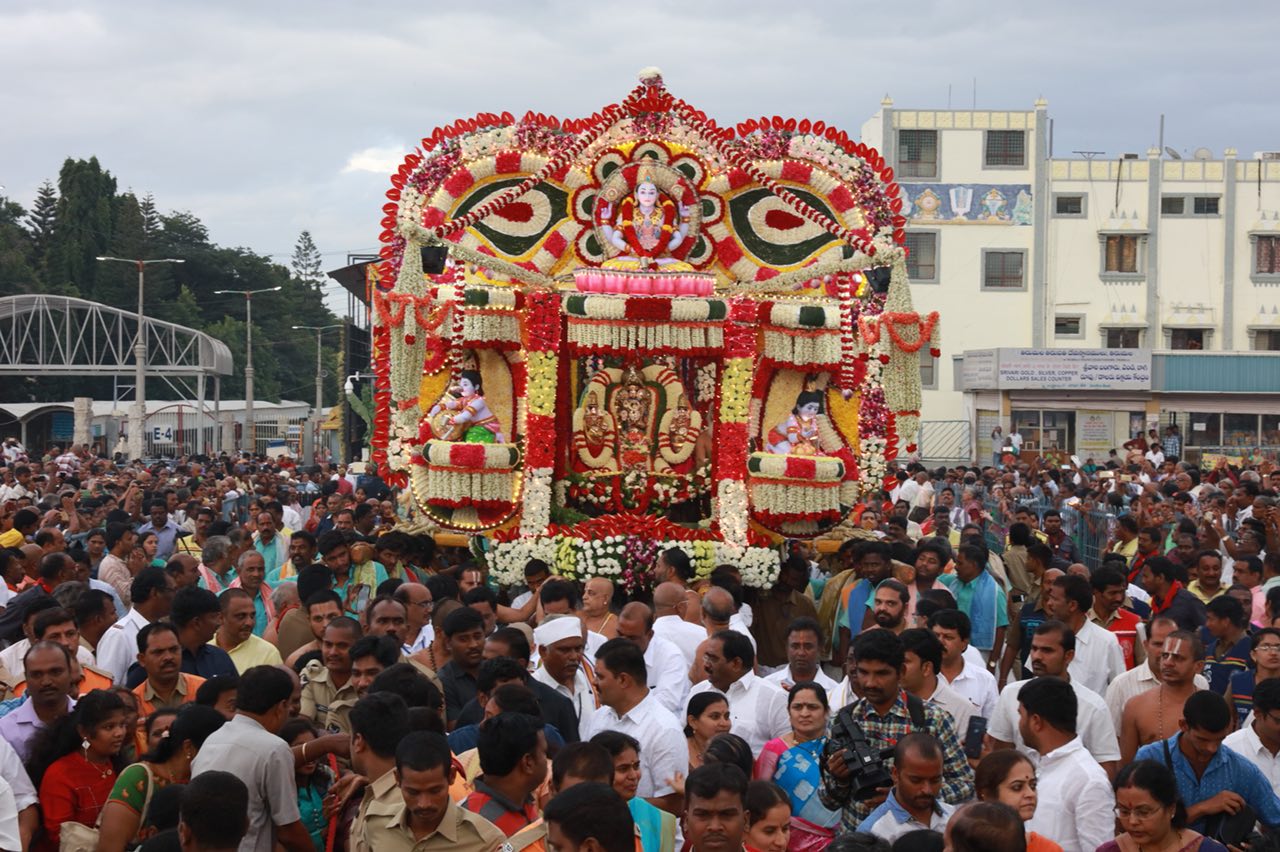 The processional deities of Lord Malayappa swamy flanked on either side by his two divine consorts mounted atop the flower bedecked palanquin was taken around in a grand procession around the mada streets encircling the hill shrine.