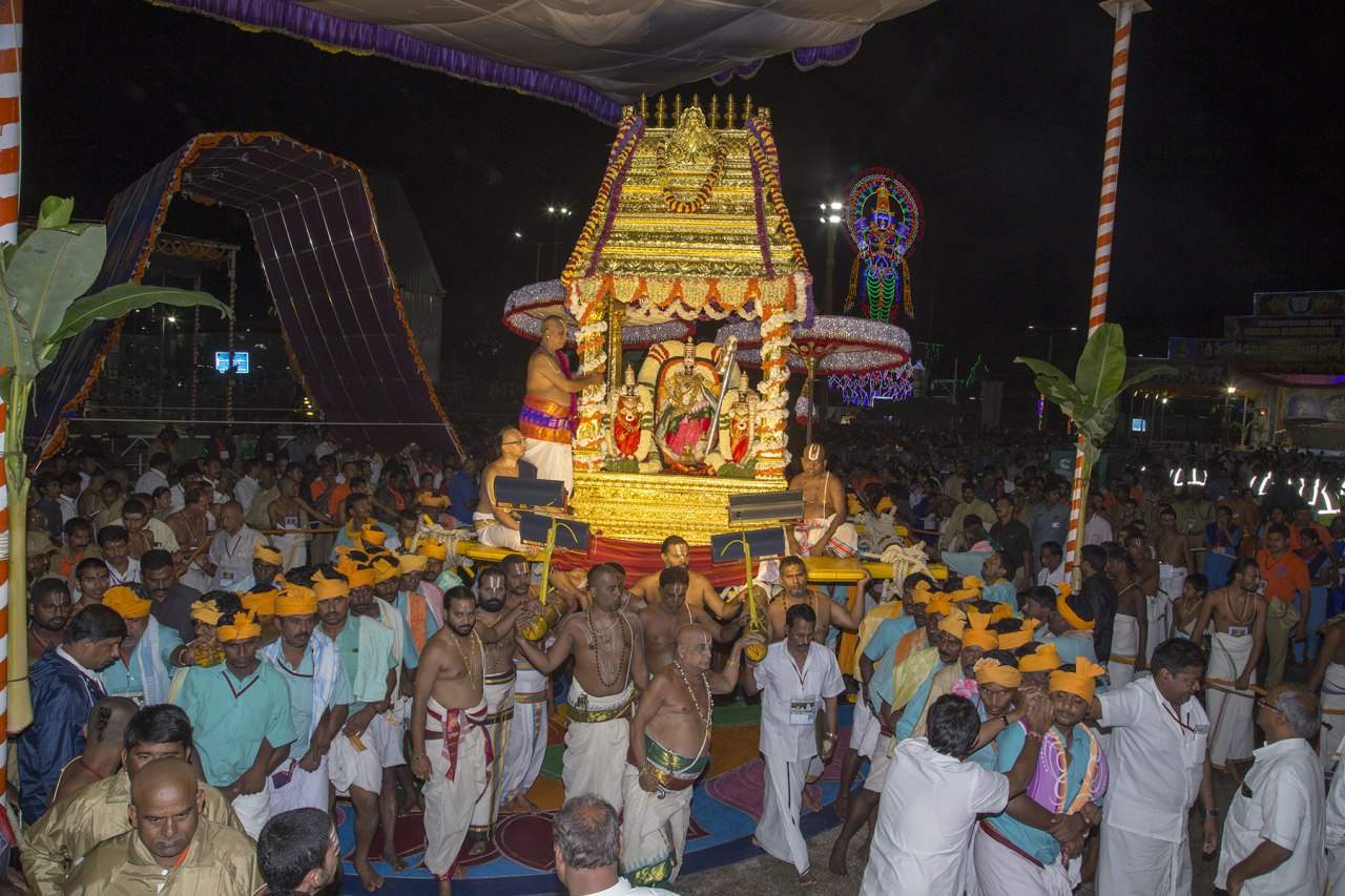 On the fourth day evening the Sri Malayappa Swamy was taken out in procession on a vehicle called Sarva Bhoopala Vahanam signifying the majesty of the deity as the supreme ruler of the universe.