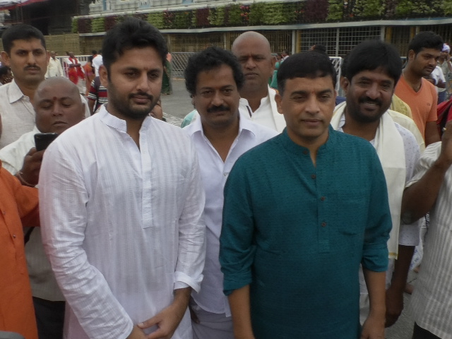 Srinivasa Kalyanam movie unit has visited Tirumala hill shrine to offer their prayers to Lord Venkateswara. Hero Nithin, producer Dil Raju had darshan of the deity during VIP break today morning. After darshan temple officials offered Laddu prasadam and holy water to them at Ranganayakula Mandapam.