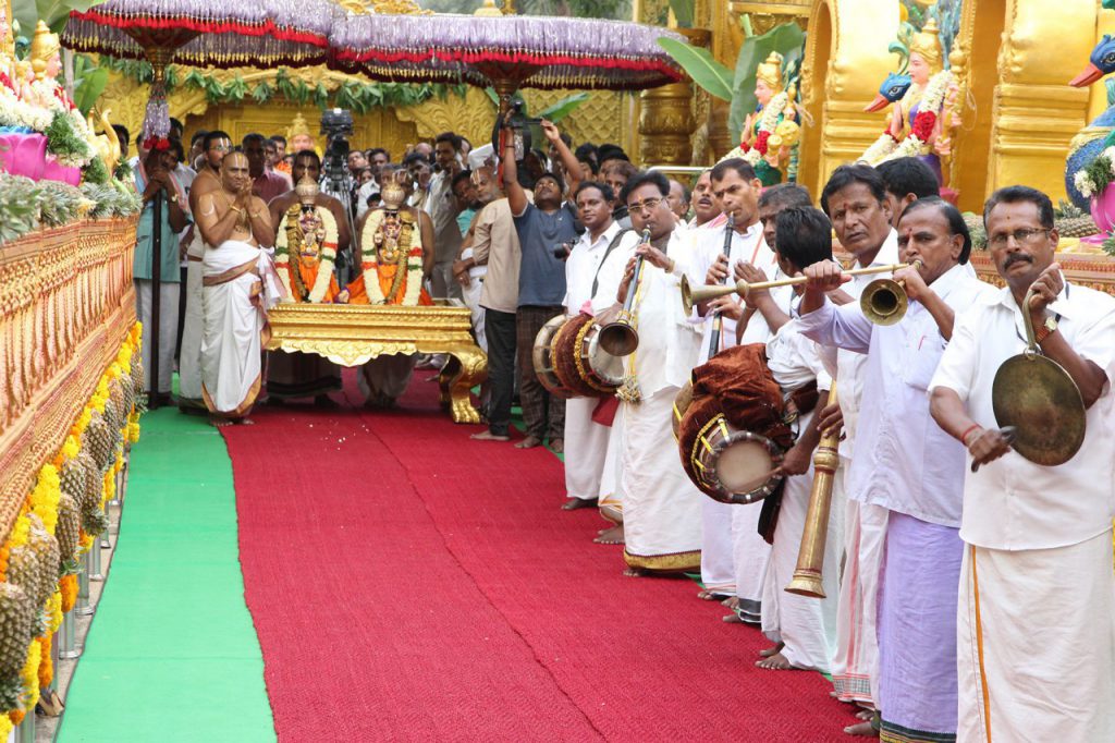 On the first of the three day festival, Sri Malayppa, the processional deity of Sri Venkateswara Swamy seated on small Gaja Vahanam was brought to Parinayotsava Mandapam located at Narayanagiri Gardens amidst traditional mela from Vaibhavotsava Mandapam. Sridevi and Bhudevi, the consorts of Lord, seated separately on two palanquins were also brought to the Gardens.