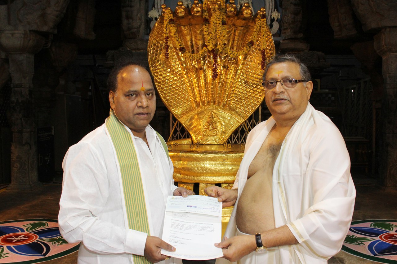 Donation of Rs One Crore to TTDs ANNAPRASADAM TRUST BY SRI PRATAP REDDY, CHAIRMAN PENNA CEMENTS. HE HAS HANDED OVER THE DD TO TML JEO SRI KS SREENIVASA RAJU INSIDE SRIVARI TEMPLE TODAY MORNING