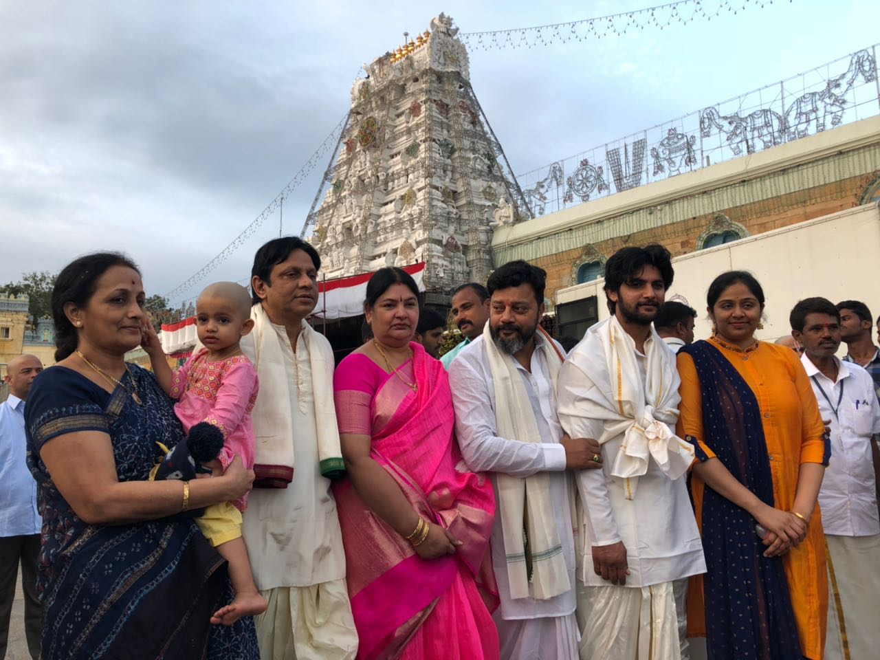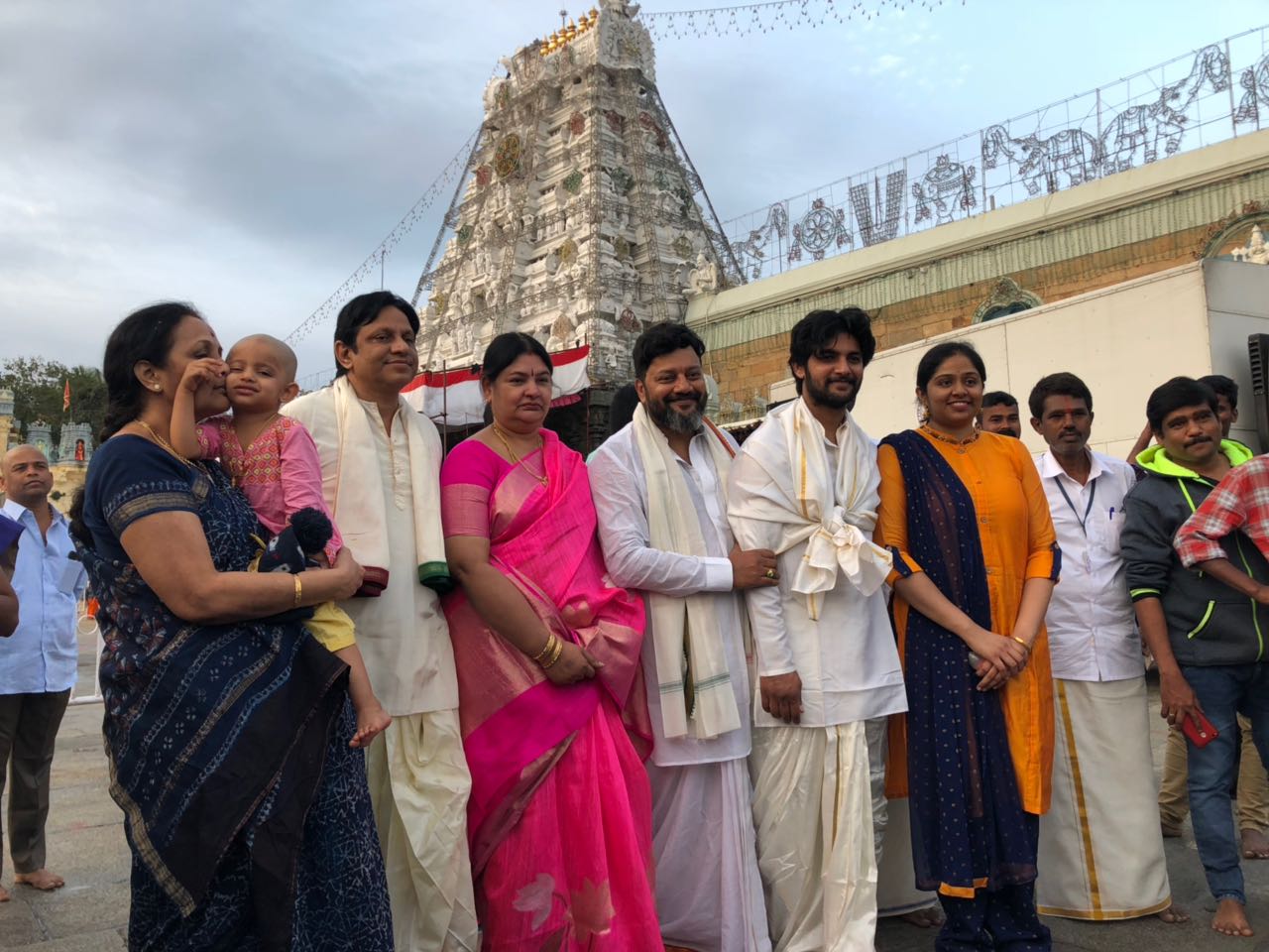Dialogue King Saikumar on Saturday offered prayers at the famous hill temple of Lord Venkateswara along with his family members. The family had come the the sacred place to get their granddaughter Ayaana tonsured in fulfillment of their prayers.