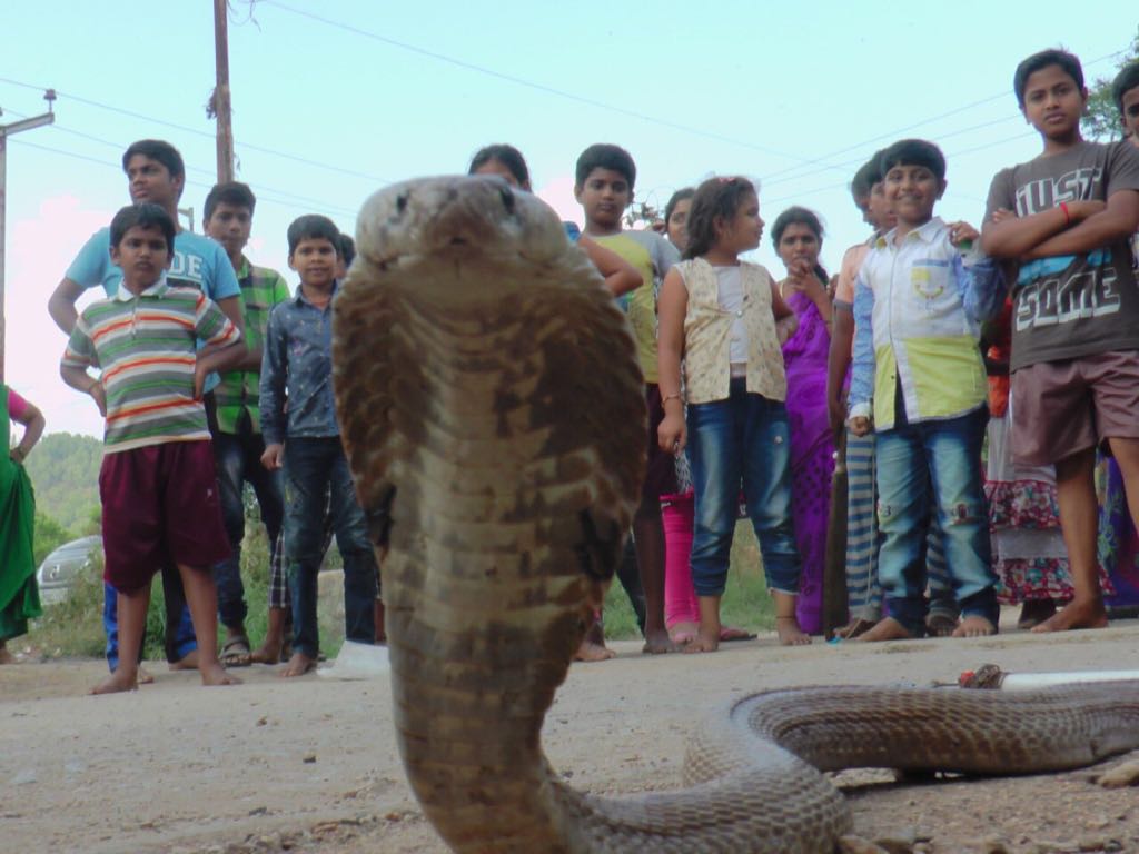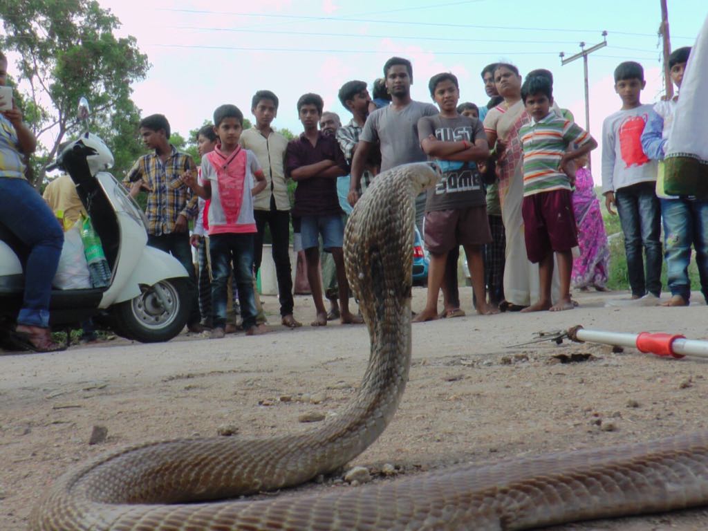 Snake created panic among Balaji Nagar residents in the world famous hill shrine Tirumala. Children who are playing on the roads spotted the six feet cobra near their residence. The presence of the snake created commotion and they immediately alerted the snake catcher Munaswamy. After receiving call from them, Munaswamy reached the spot and caught the reptile safely.