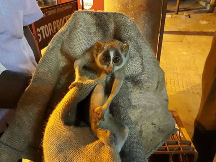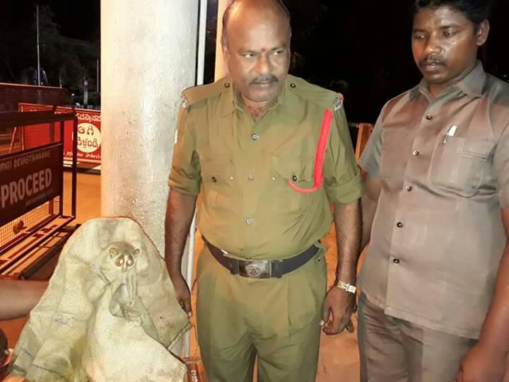 The Tirumala Police on Tuesday rescue a Slender Loris (Devanga Pilli) which had strayed into the roads of hill shrine. Slender loris is an endangered species native to the rainforests of Sri Lanka and Southern India. These animals are about 25 cm long and have long, thin arms. They weigh around 275 grams. They have a small, vestigial tail. Loris is covered with fur. Color of the fur can be grey, brown, yellow, red, silver or golden.