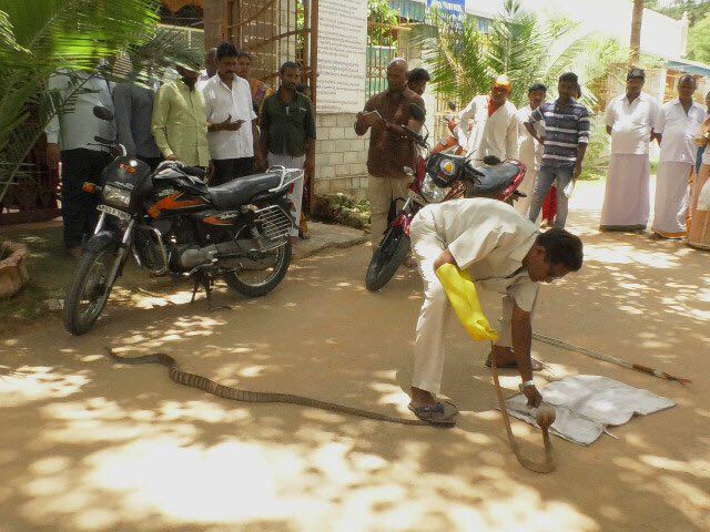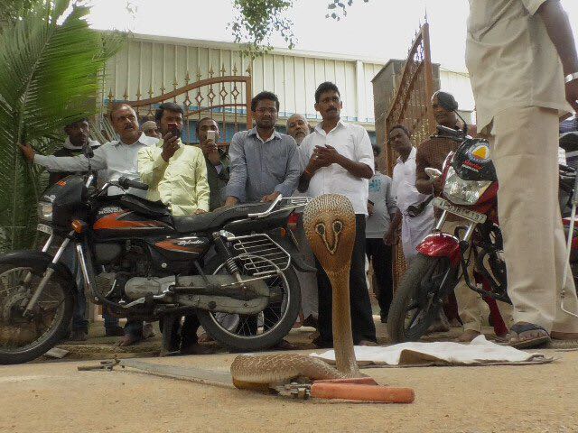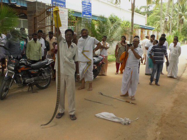 Venemous snakes sparked panic among pilgrims once again in the world famous hill shrine Tirumala. A 9 feet Jeripothu was spotted roaming near EO Camp Office. On the same way a 4 feet Cobra made its way to the Kalyanavedika on the path of Papavinasanam. The presence of the snake created commotion and kept residents and devotees prompting to alert snake catcher Bhaskar Naidu. After receiving call from TTD staff, Bhaskar Naidu reached the spot and managed to catch the snakes with the help of snake catching stick. Later he released the snakes into the forest.
