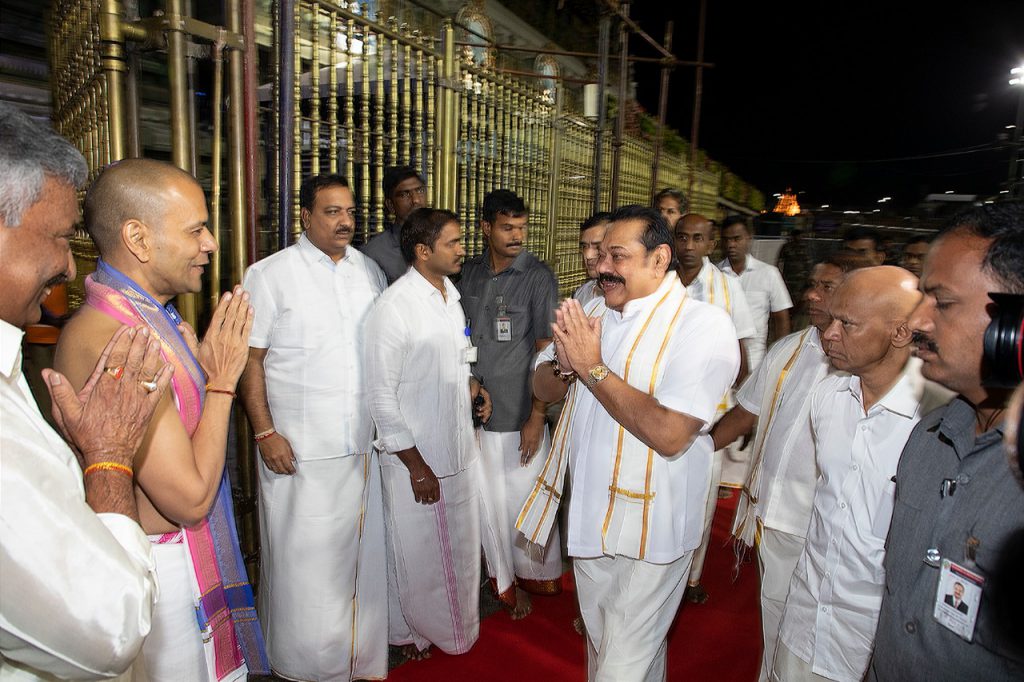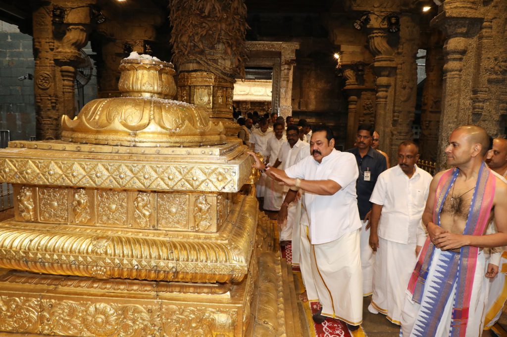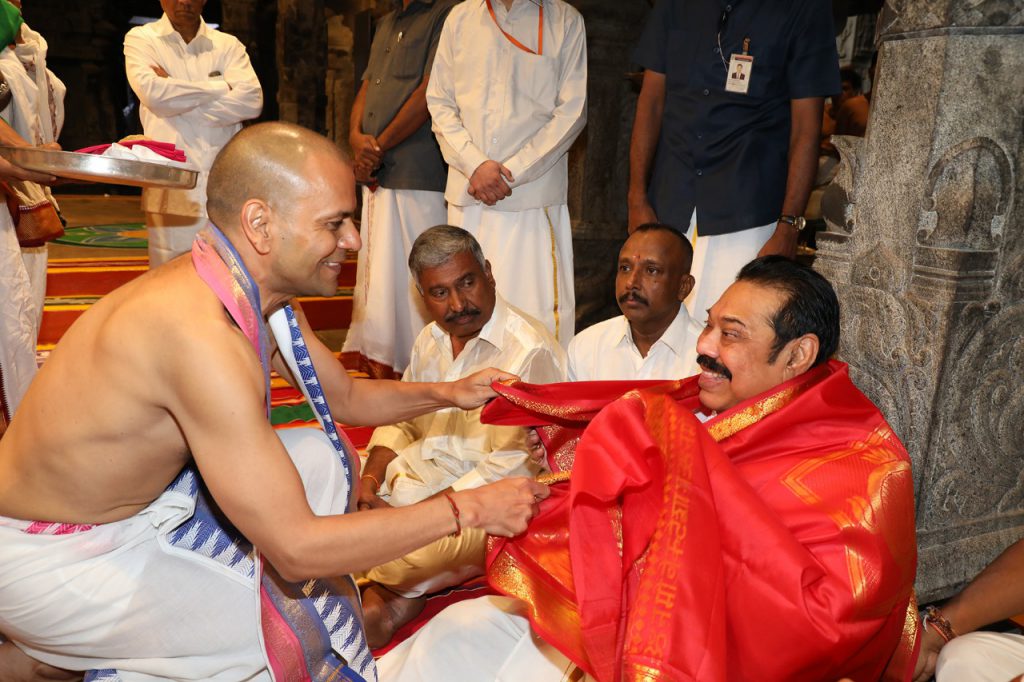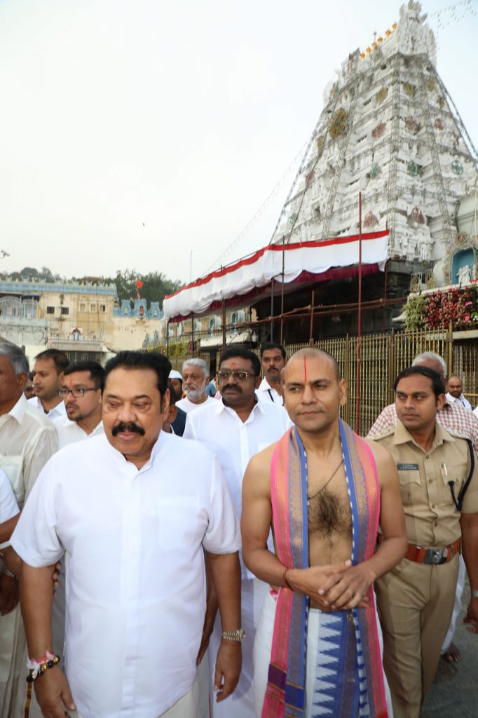 The Honourable Prime Minister of Sri Lanka, Sri Mahinda Rajapaksa, accompanied by his cabinet minister Sri Arumugan Thondaman and his son Sri Yoshita Rajapaksa offered prayers in the hill shrine of Lord Venkateswara on Tuesday morning.