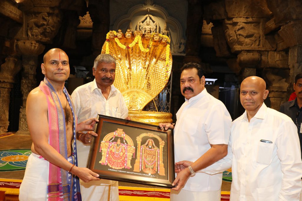 After darshan, the Veda pundits offered Vedaseervachanam in Ranganayakula Mandapam to the Lankan Prime Minister. He was later presented theertha prasadams.