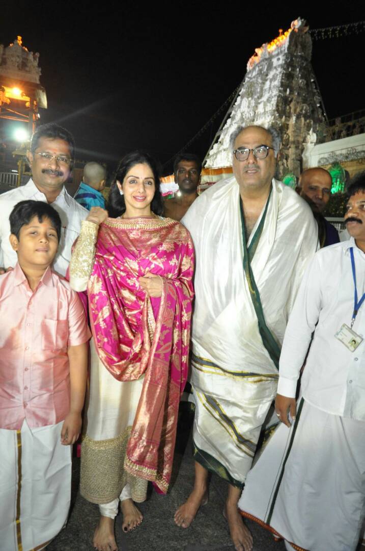 Sridevi Kapoor is an Indian film actress who has worked in Tamil, Telugu, Hindi, Malayalam and Kannada films. She has been called the first female superstar of Hindi cinema visited Tirumala today early hours. Sridevi with her husband Boney Kapoor along with their relatives today offered prayers at Tirumala Tirupathi temple. Temple authorities made necessary arrangements to the couple to participate in Sri Venkateswara Swamy Suprabatha Seva.