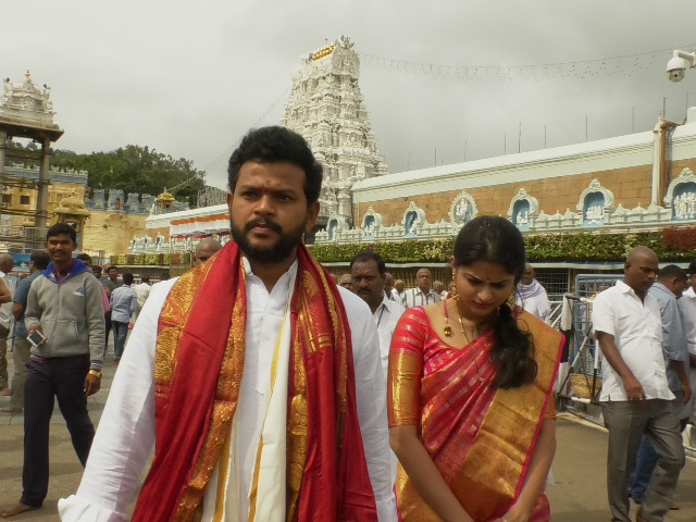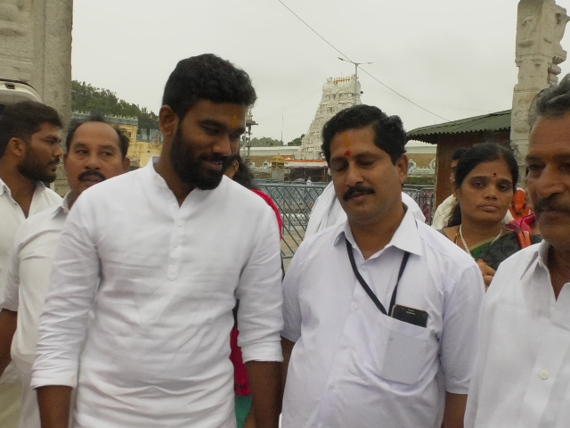 Srikakulam TDP MP Ram Mohan Naidu Kinjarapu has visited Tirumala and offered his prayers to Lord Venkateswara temple on Friday. Accompanied by his wife, Ram Mohan offered his prayers to the presiding deity during VIP Break darshan today morning. After darshan, temple preists offered them the sacred holy water, Laddu prasadam at Ranganayakula mandapam.