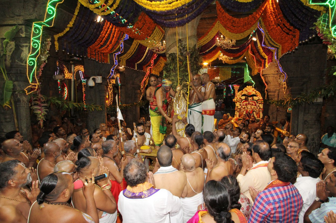 Garuda Dhyanam, Bheri Puja, Bheri Tadanam, Garuda Gadyam, Dikpalaka Gadyam, Garuda Lagnastakam and Garuda Choornika, a total of seven mantras recited while lowering the Garuda Pataka on Sunday evening.
