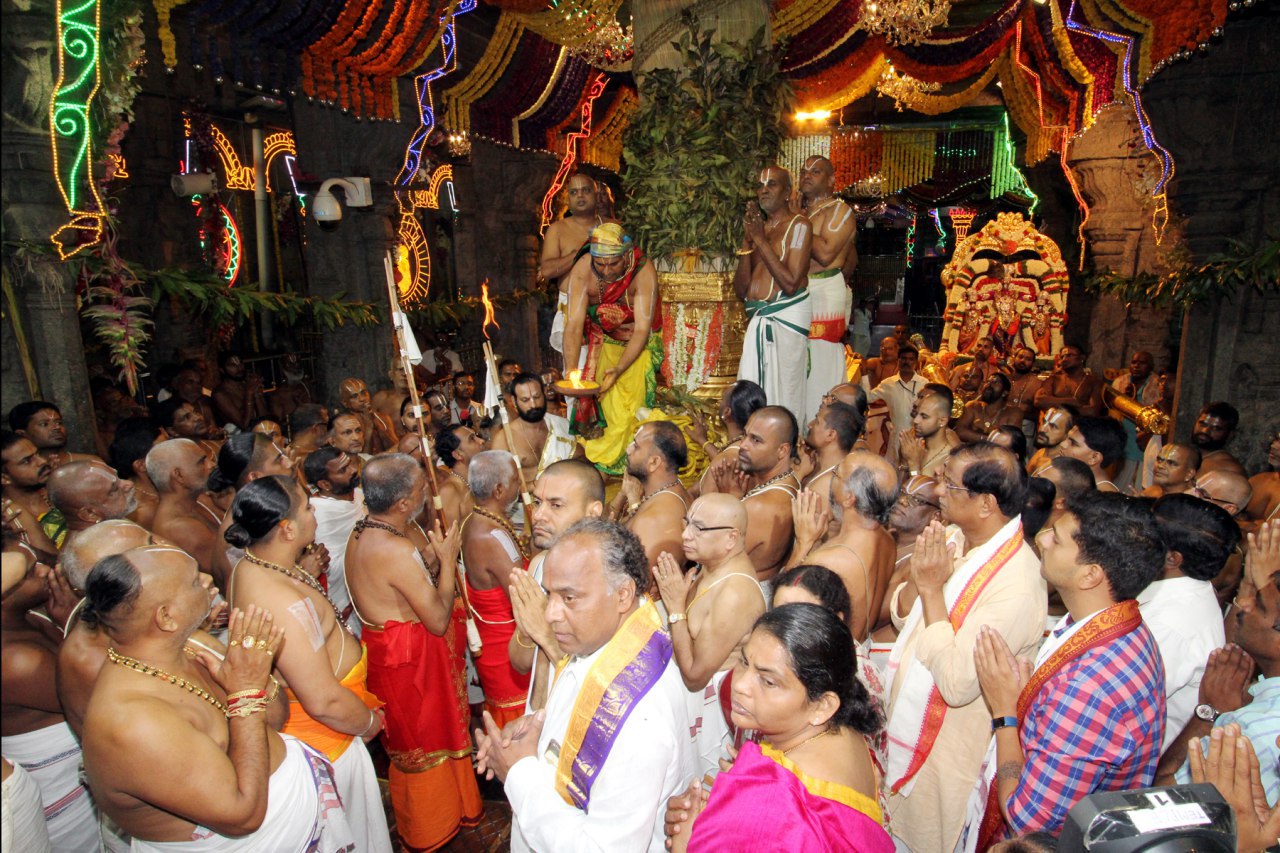 The temple priests chanted the Vedic hymns and special Puja was performed to Dhwajasthambham, the temple pillar where the “Garuda Pataka” was hoisted on the first day of brahmotsavam.