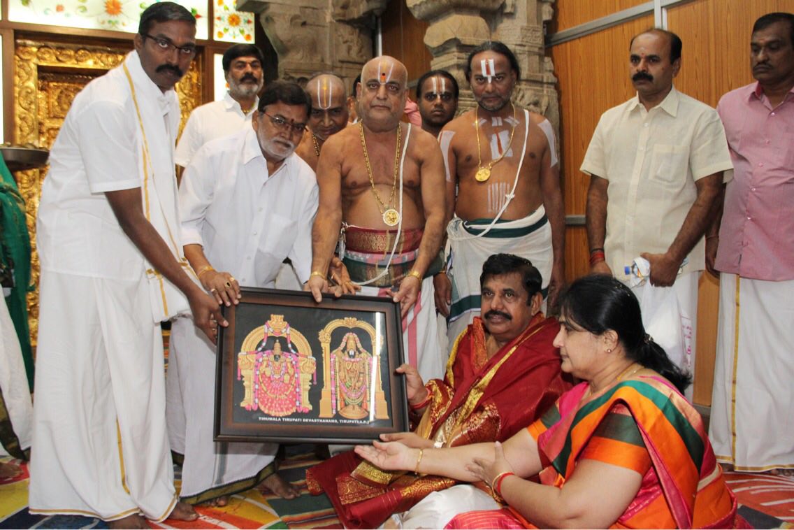 Tamil Nadu Chief Minister Edapadi Palanisamy offered prayers in the world renowned Hindu shrine of Lord Venkateswara at Tirumala on Tuesday. Accompanied by his wife, Palanisamy participated in the Astadalapaadapadmaraadha seva and had darshan of the diety. TN CM spent few minutes praying before the presiding deity of Lord Venkateswara and later reached Ranganayakula Mandapam where he was accorded Vedasirvachanam by priests.