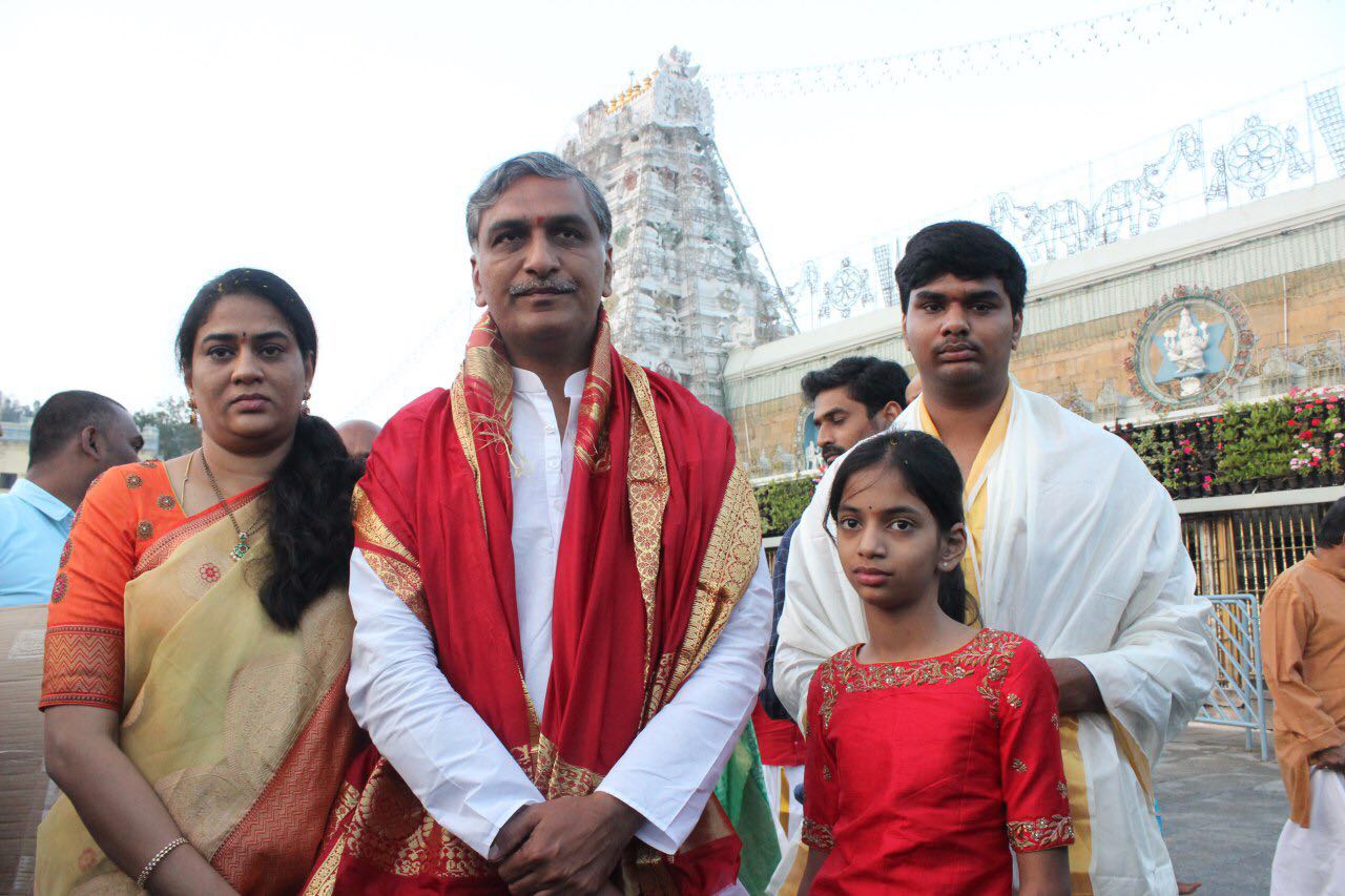 Telangana Minister Harish Rao on Sunday visited Tirumala hill shrine to offer his prayers to Lord Venkateswara. Accompanied by his family, Harish Rao had darshan of the deity during VIP break. After darshan, temple preists gave vedasirvachanam and presented laddu prasadam and holy water to the minister at Ranganayakula Mandapam.