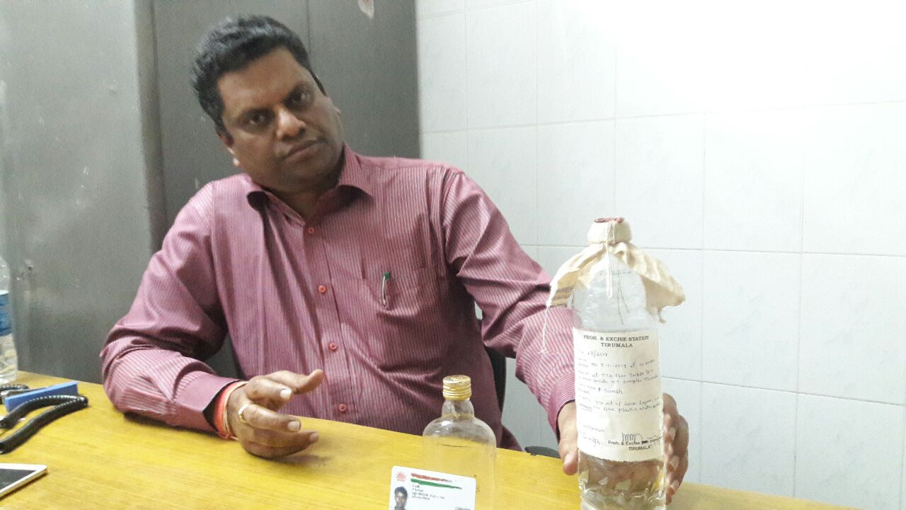 Tirumala excise police on Tuesday arrested a man identified as Penumuru Suresh, native of Renigunta and seized 1 litre of liquor from his possession near Rambageecha guest house. Suresh working as JCB driver used to smuggle Vodka, Jin, White Wine to Tirumala in water bottles. After getting specific information, police conducted search and nabbed him red-handed with the liquor bottle. An fir was booked on the accused and sent to remand. Possession, transaction and consumption of liquor is strictly banned at the Tirumala hill shrine.