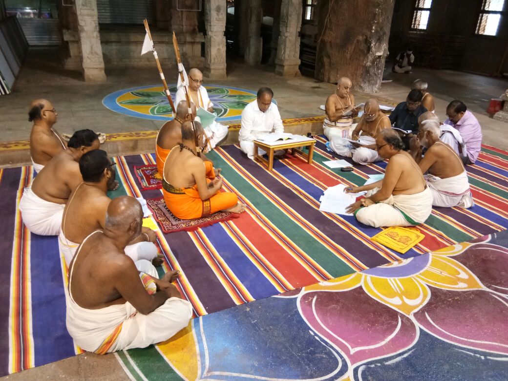 TTD JEO Sri K. Srinivasa Raju met HH Pedda Jeeyar Swamiji and HH Chinna Jeeyar Swamiji in vasanthamandapam, Tirumala. JEO invited HH Swamijis to come to the Brahmostavams going to commence in Tirumala this month end. HH Sri Swamijis explained briefly the details of the brahmostavams and made a request to complete this event with esteem spirituality. The meeting concluded with HH to participate in all necessary events of Tirumala Tirupati Brahmostavams.