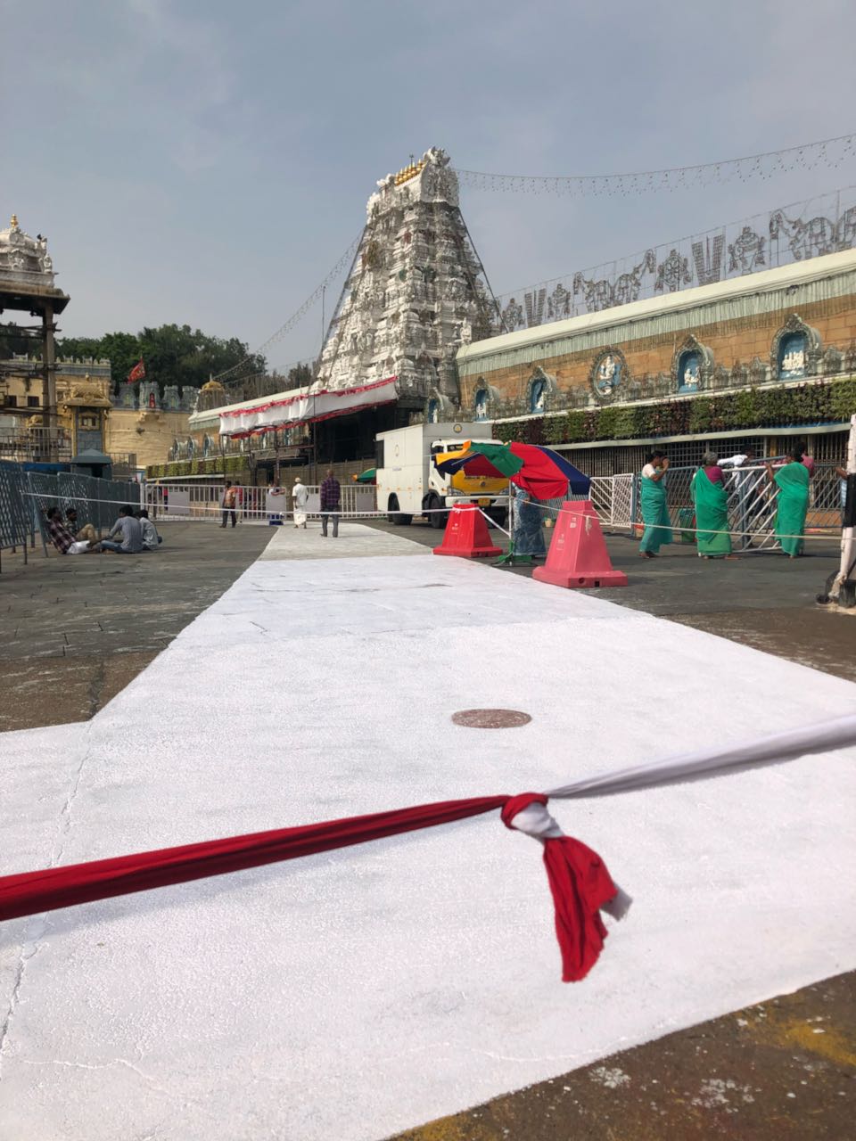 With the temperature soaring above 40 degree Celsius in many places in Andhra Pradesh, TTD administration on Wednesday painted the temple surroundings with cool paint for the devotees who visit the temple.