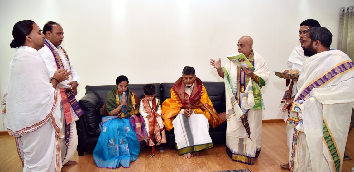 In connection with Vilambi Nama Ugadi, a team of Veda pundits from TTD offered Vedasirvachanam to honourable CM of Andhra Pradesh Sri Nara Chandrababu Naidu in his residence at Vijayawada on Sunday.TTD Tirumala JEO Sri KS Sreenivasa Raju offered prasadams to CM.