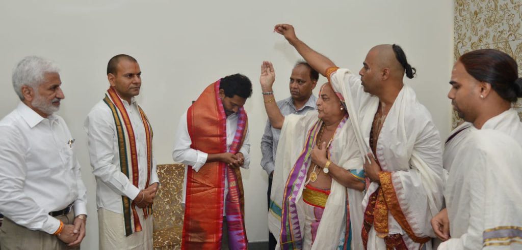 The EO and JEO presented sesha vastram, theerta prasadams of Sri Venkateswara Swamy to Sri YS Jagan Mohan Reddy while the veda pundits offered Vedasirvachanam.
