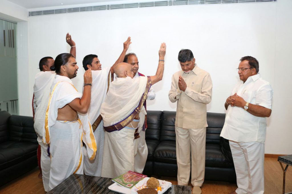Vijayawada, 29 March 2017: In connection with Hemalambi Ugadi, a team of Veda pundits from TTD offered Vedasirvachanam to honourable CM of Andhra Pradesh Sri N Chandrababu Naidu in his residence at Vijayawada on Wednesday.