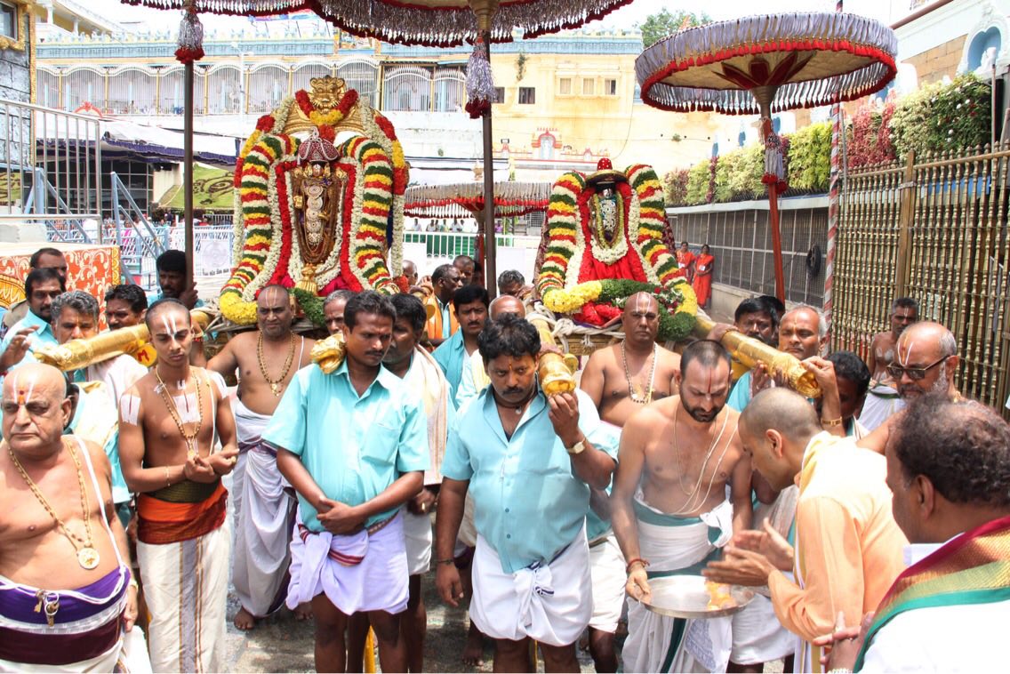 The event began with the processional deities of Lord Malayappa Swamy and Lord Sri Krishna Swamy varu taken around in a grand procession on golden ‘Tiruchi’ around the mada streets encircling the holy shrine starting from Pedda Jiyangar Mutt adjacent to Sri Bedi Anjaneyulu Swamy temple.
