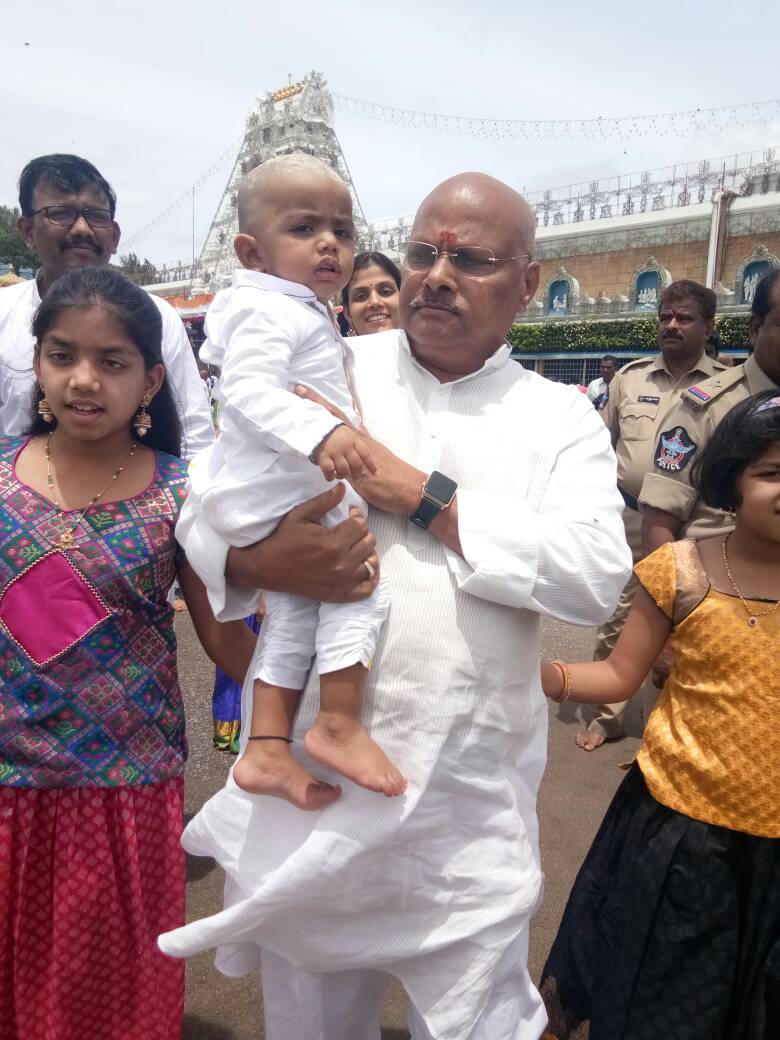 AP Finance Minister Yanamala Ramakrishnudu’s family members had a darshan of Lord Balaji today at Tirumala. During their Tirumala visit, Yanamala grandson Yanamala, his wife Vijayalakshmi, son Appa Rao, daughter-in-law and grandson reached the temple shrine . Yanamala tonsured his grandson head at Kalyana Katta and took part in the service of the lord. After darshan the family got veda aasirvachanam from the temple priests at the Ranganayakula Mandapam.