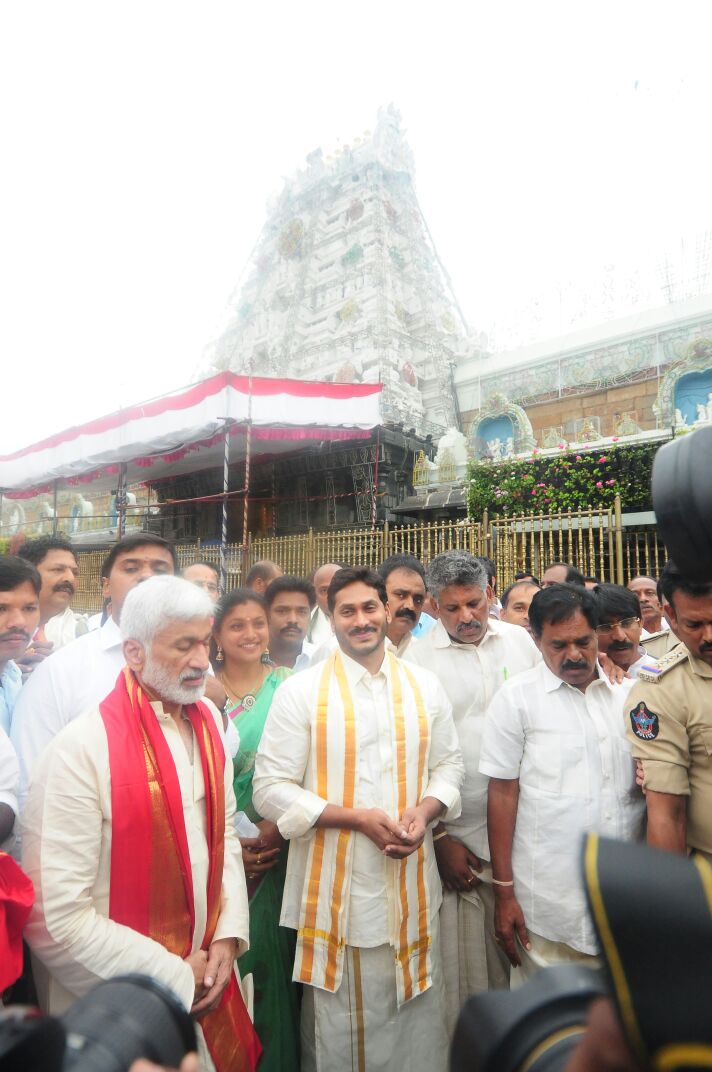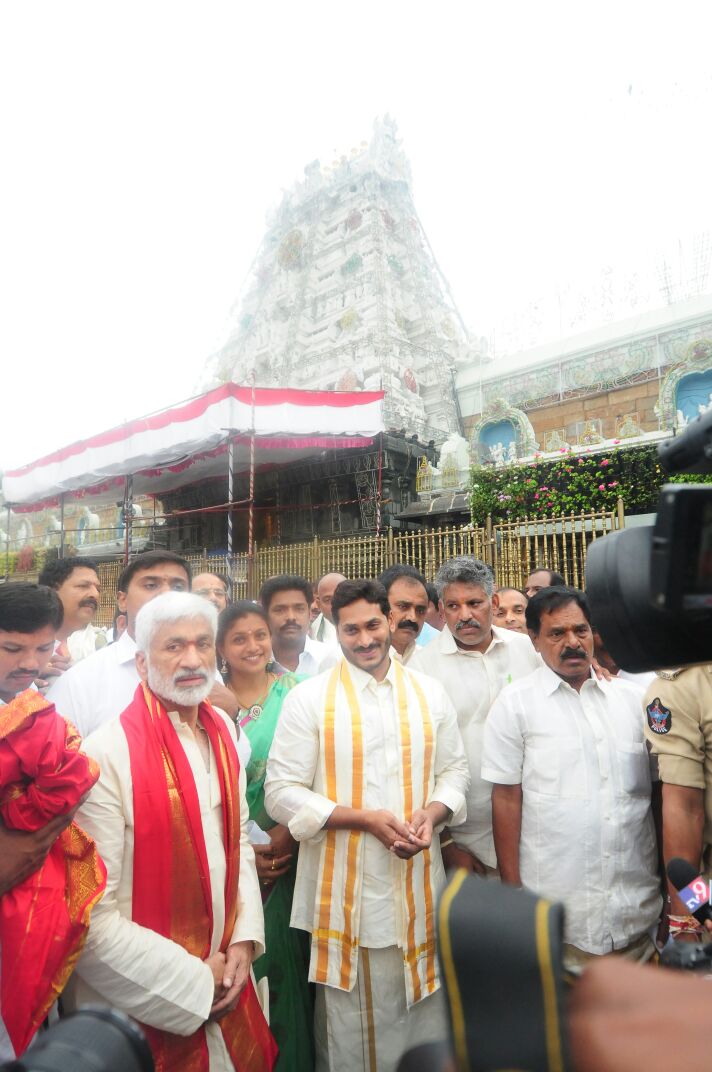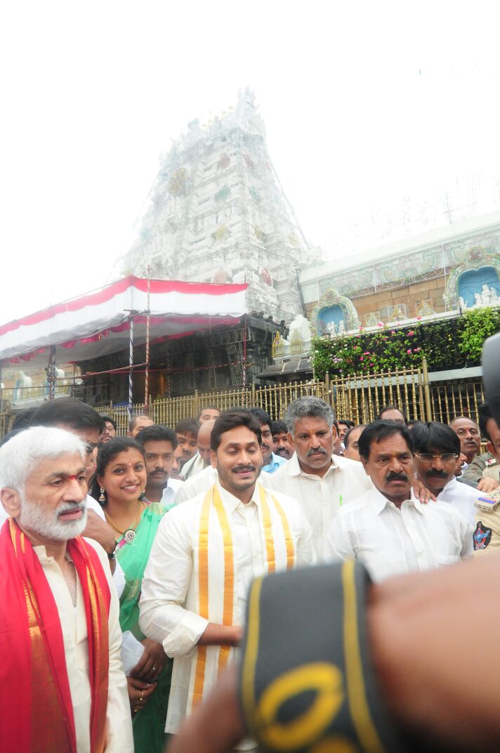 YSRCP chief Jagan Mohan Reddy had darshan of Sri Venkateswara Swamy at Tirumala on Saturday early morning. The opposition leader had darshan of the deity during the VIP break darshan. Nagari MLA Roja, Chevireddy Bhaskar Reddy, P Ramachandra Reddy, Bhumana Karunakar Reddy accompanied him. Later, TTD officials offered Lord’s silk vastram, Laddu prasadam and lamination photo of Lord Venkateswara to Jagan.